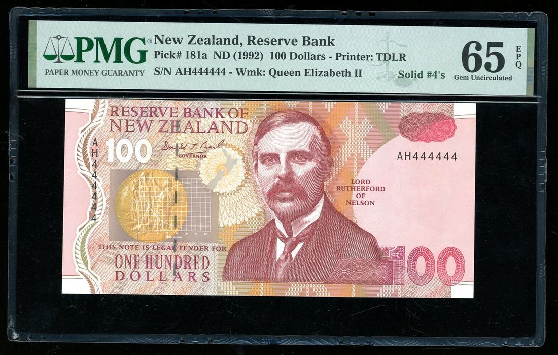 New Zealand, $100, ND(1992), solid serial number AH444444, (Pick 181a), PMG 65EPQ.