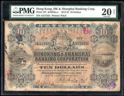 1913年香港上海匯豐銀行拾圓,編號A217253,藍色,左側有建築及山景,右側有「海灘」場景,反面橙色,一個手簽名,印刷簽名Stabb,PMG 20NET,有修復及墨水。非常稀有之早期「紅背」類型,四大「風景」系列中備受追捧之版式,為少數幾個設計中使用香港原生風景的設計之一
