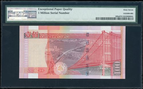 HongKong & Shanghai Banking Corporation, $100, 1.7.2003, 1 million serial number BW1000000, (Pick 209a), PMG 67EPQ. 1 million serial number notes are no longer issued in HK. Getting scarcer as time goes