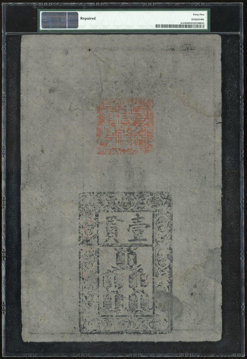 1368-99年大明通行寶鈔壹貫,正面兩枚紅色蓋章,背面一枚紅色蓋章,PMG 45,有修補,明朝官方發行的唯一紙幣,絕對經典
