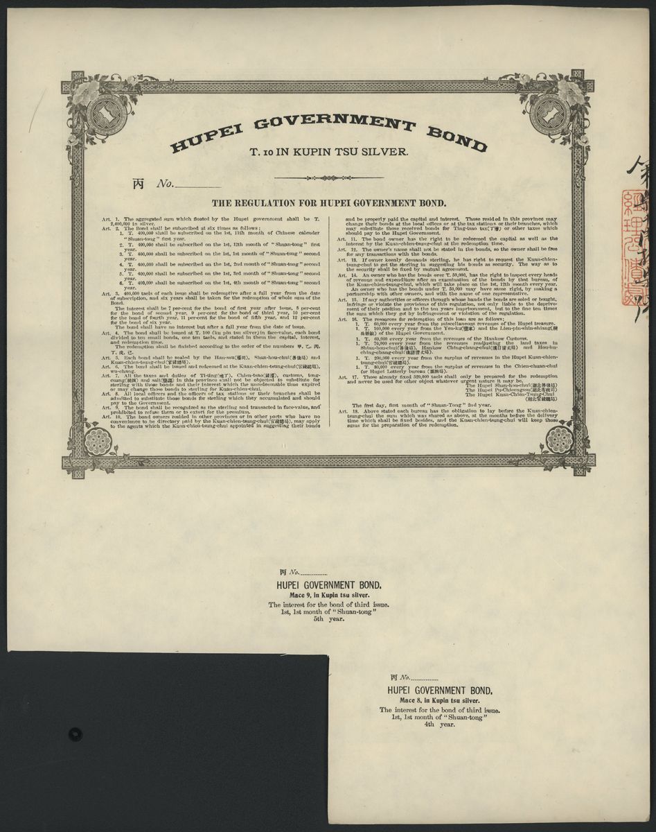 Hupeh Government Bond, China, certificate of 10 taels in silver, Xuantong Year 2(1910), number 7067, with two coupons, well preserved, some foxing, about uncirculated, rare.