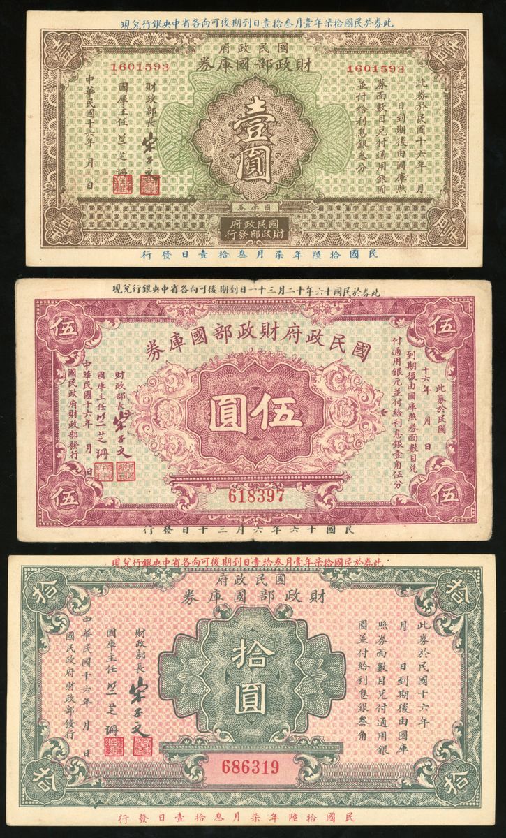 民國十六年財政部長期公債券一組3枚,包括壹、伍及拾圓,伍圓AVF品相,其餘EF