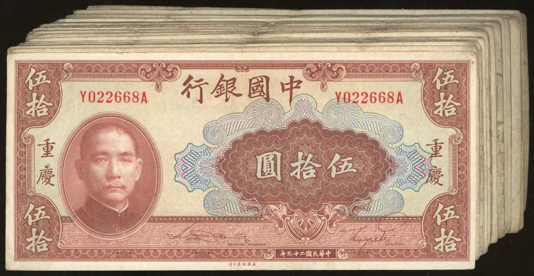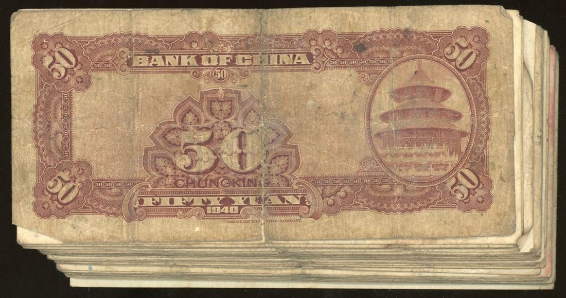 Bank of China, 50 yuan (31), Year 29 (1940), Chungking, (Pick 87), generally fine to very fine (31) From the descendant of an Overseas Chinese merchant Family.