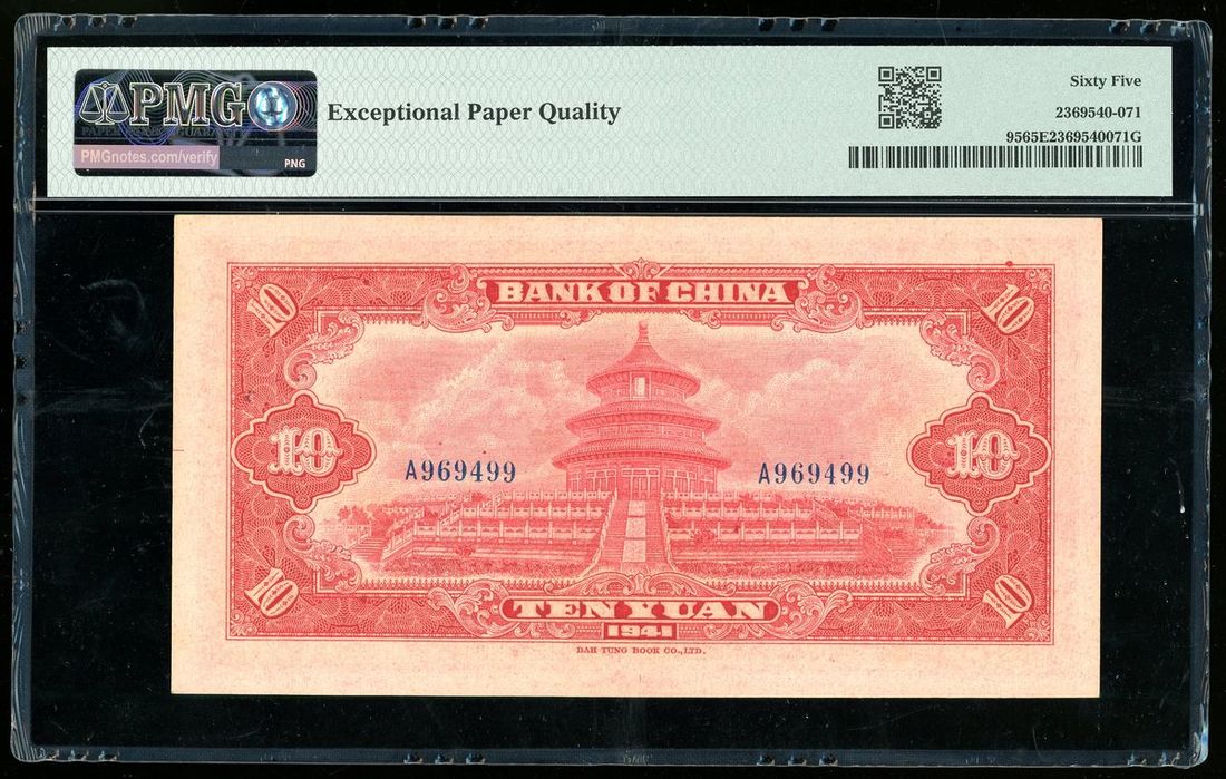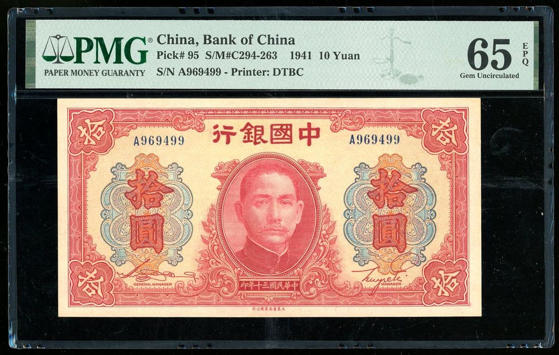Bank of China, 10 yuan, Year 30 (1941), serial number A969499, (Pick 95), PMG 65EPQ
