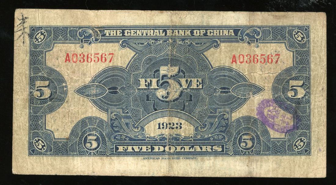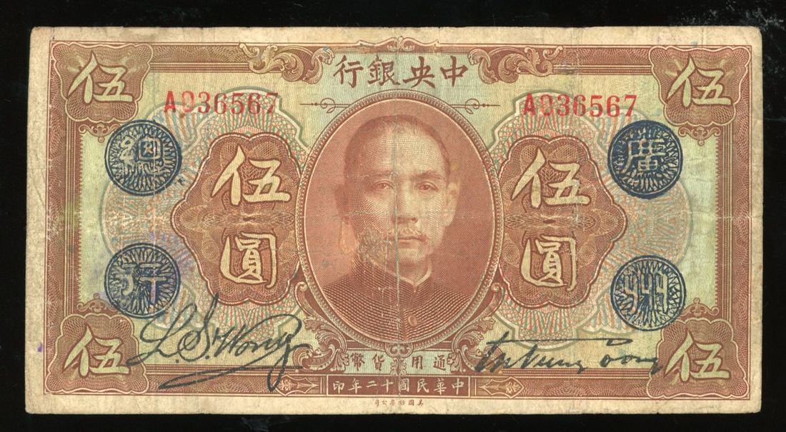 Central Bank of China, 5 yuan with KwangTung main branch overprint, Year 12 (1923), serial number A036567, signatures Soong Tse Vung and Huang Long Sheng,