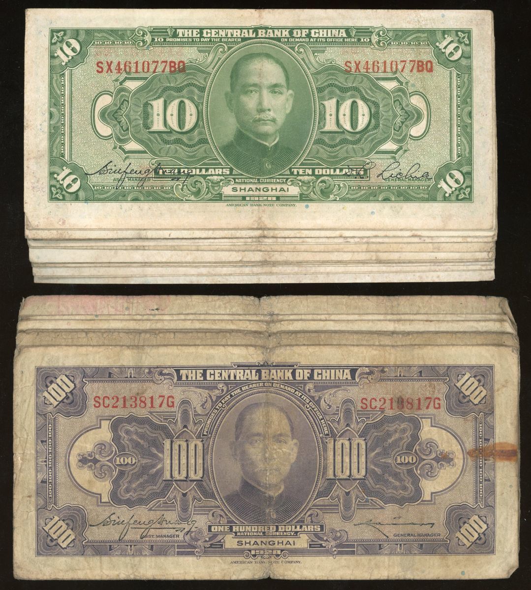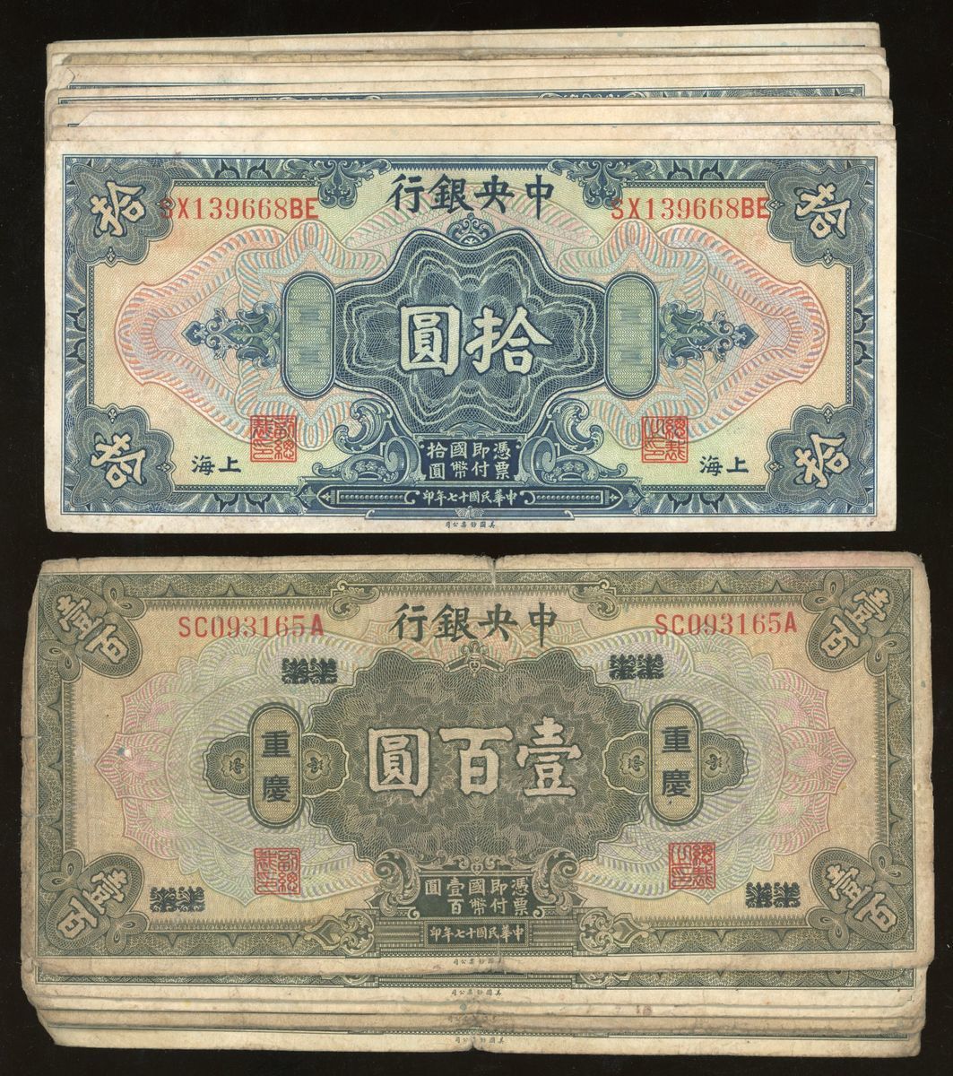 Central Bank of China, a group of 21x, 1928, including 10 yuan (15) and 100 yuan (6), some with ChungKing overprint, (Pick 198, 199), balance fine to very fine (28) From the descendant of an Overseas Chinese merchant Family.