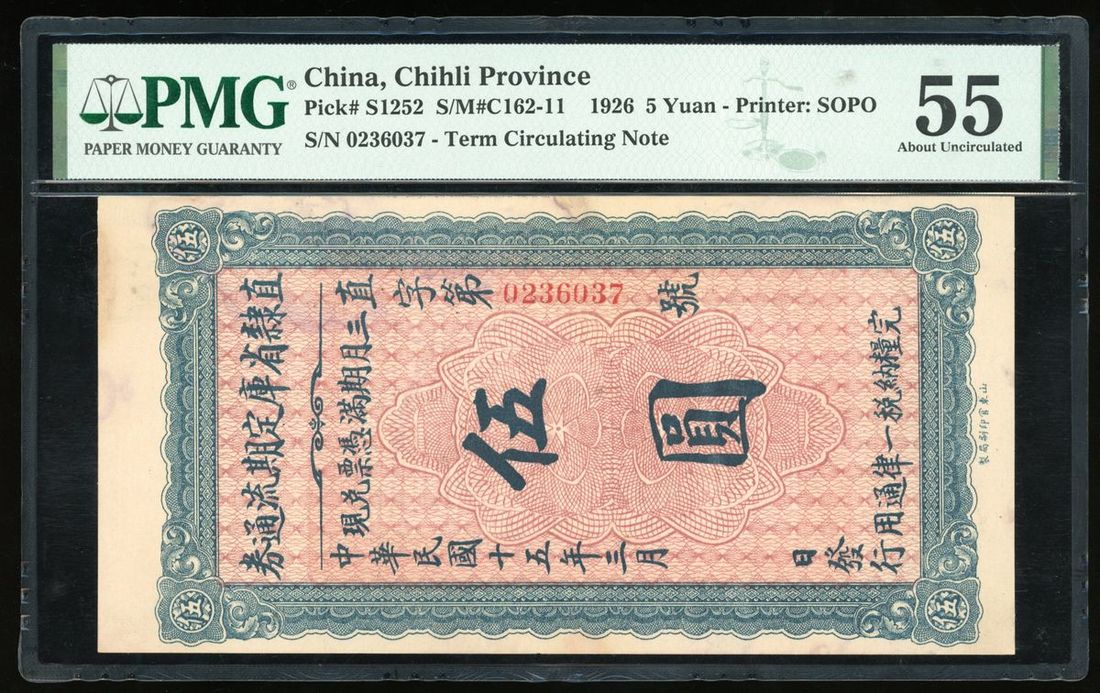 Chihli Province, China, 5 yuan, 1926, Term Circulating Note, serial number 0236037, (Pick S1252), PMG 55, stains, ink.