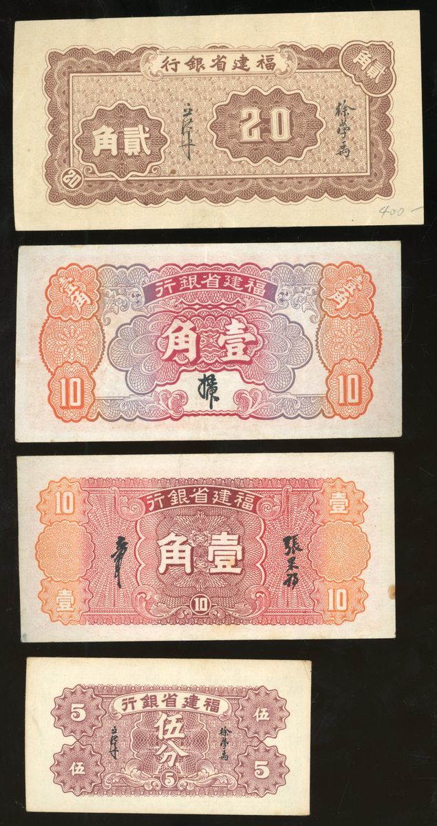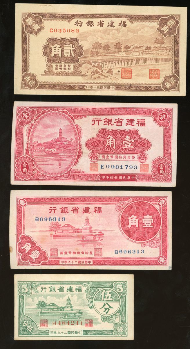 Fukien Provincial Bank, China, a group of 4x, including, including, 1 jiao 1935, 1 jiao 1937, 5 fen 1940, 2 jiao 1941,
