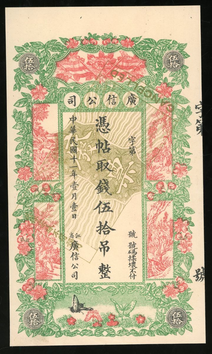 民國十一年黑龍江廣信公司伍拾吊,直式,AU品相,加蓋註銷,邊角有折痕