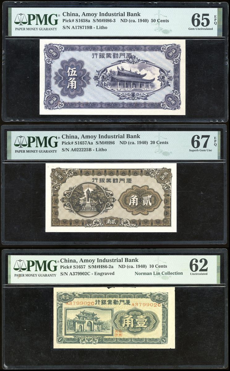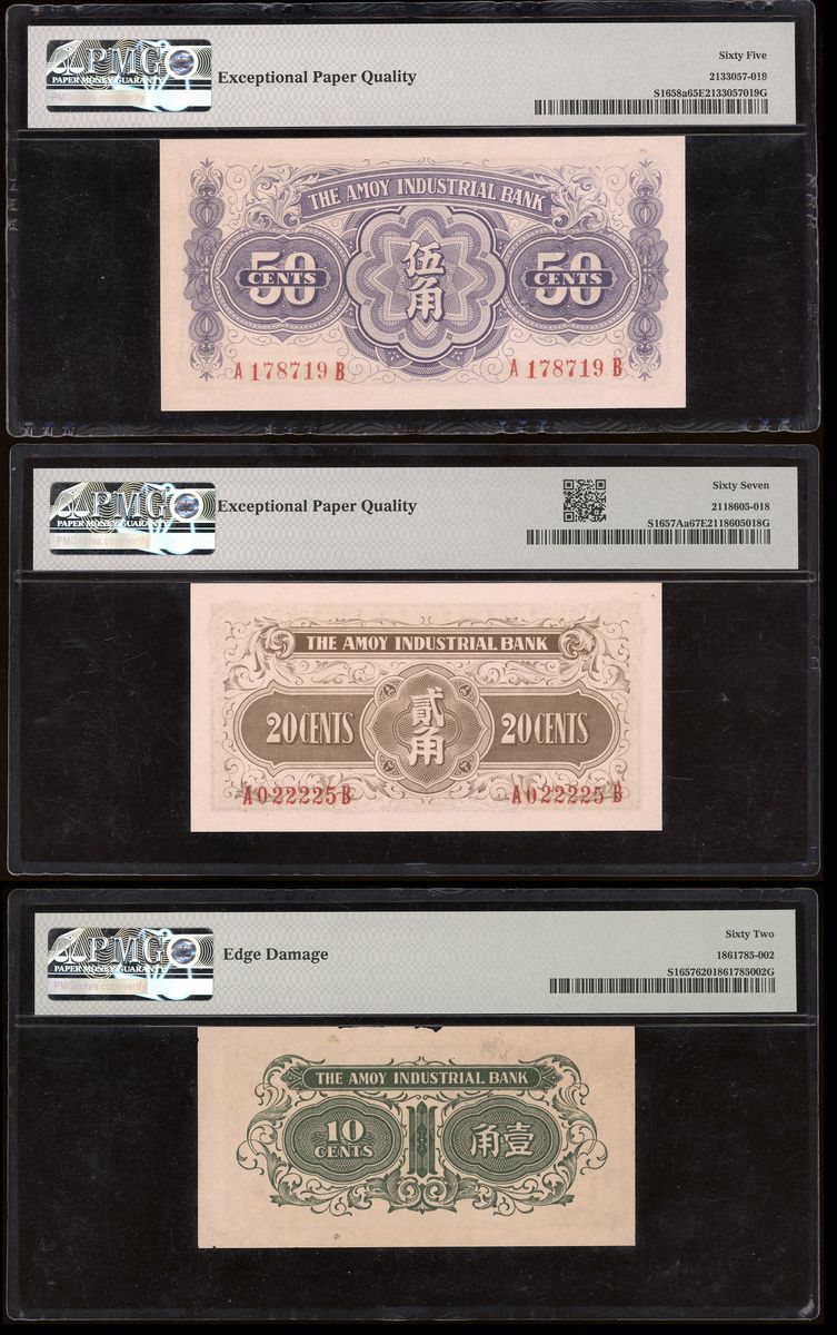 Amoy Industrial Bank, China, a group of 3x, including 10, 20 and 50 cents, ca. 1940, (Pick S1657, S1657Aa, S1658a), graded PMG 62, 67EPQ and 65EPQ (3)