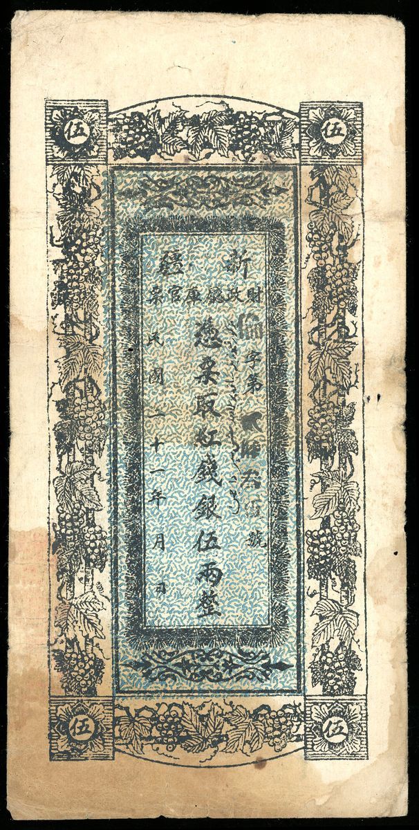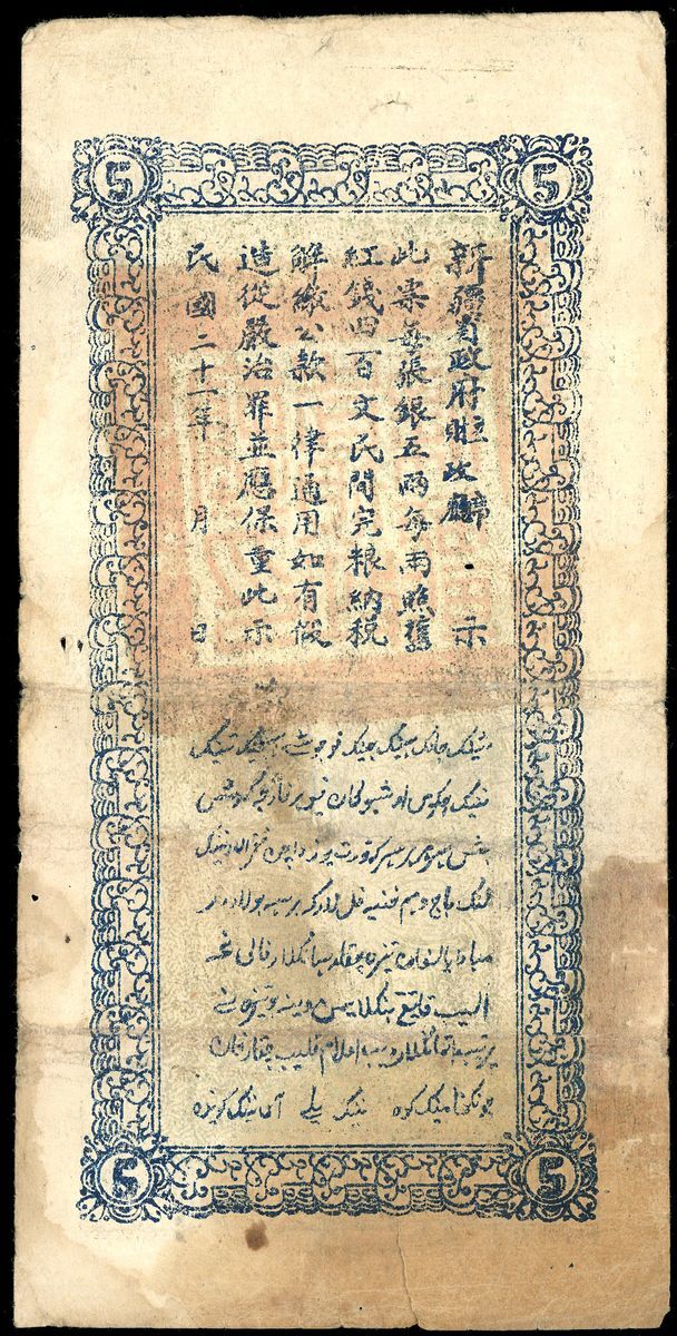 Sinkiang Finance Department Treasury, China, 5 taels, Year 21 (1932), (Pick S1869), Very Fine, stains, holes, tears