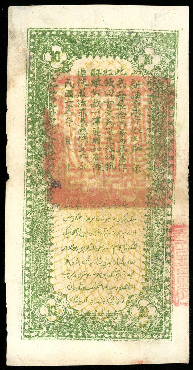 Sinkiang Finance Department Treasury, China, 10 taels, Year 22 (1933), (Pick S1875), Extremely Fine, edge damage at right