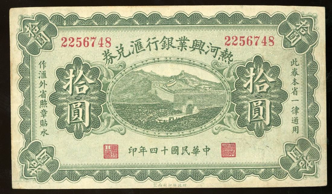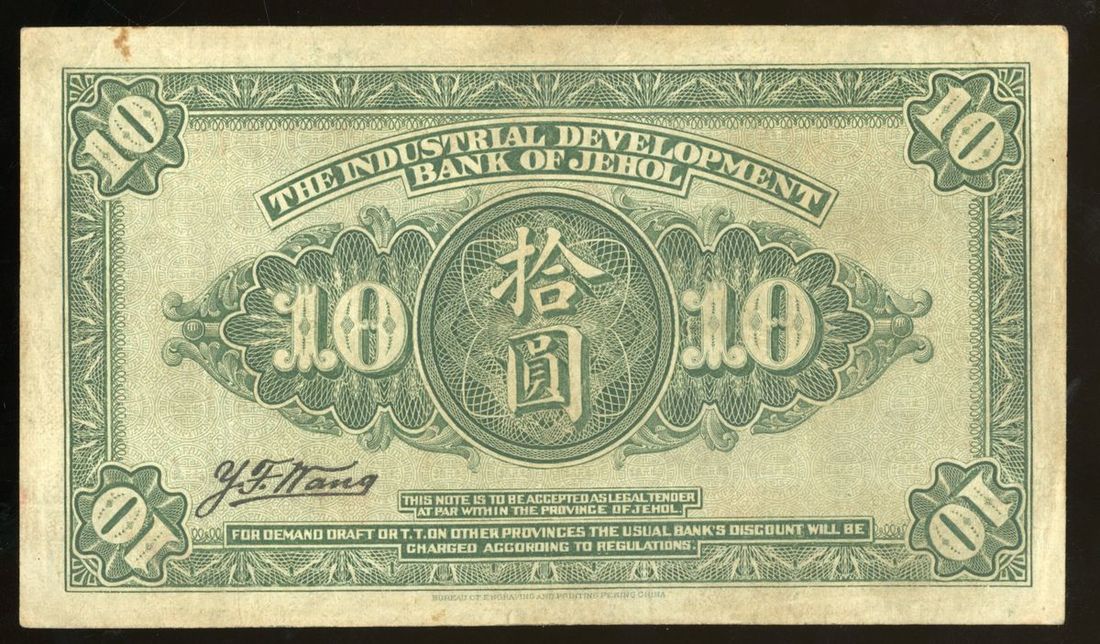 Industrial Development Bank of Jehol, China, 10 yuan, Year 14 (1925), serial number 2256748, (Pick S2188), stained, about extremely fine