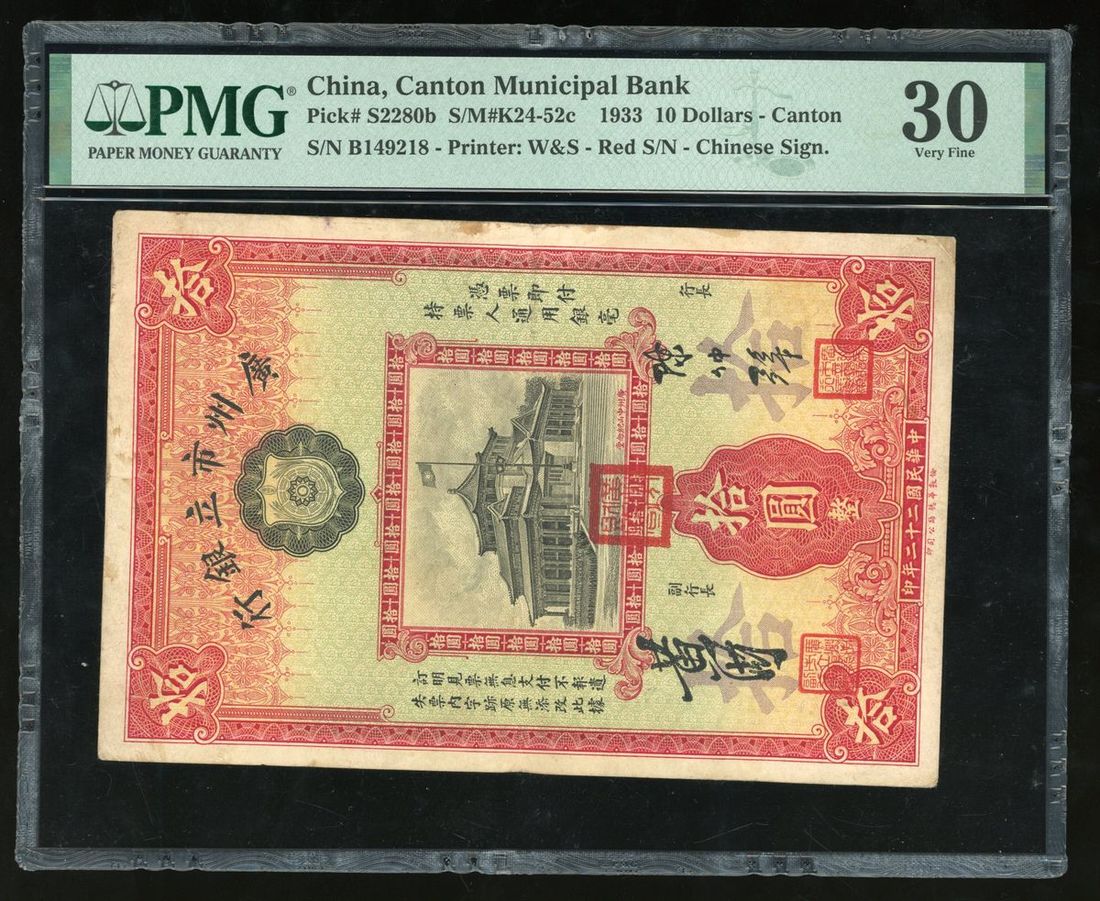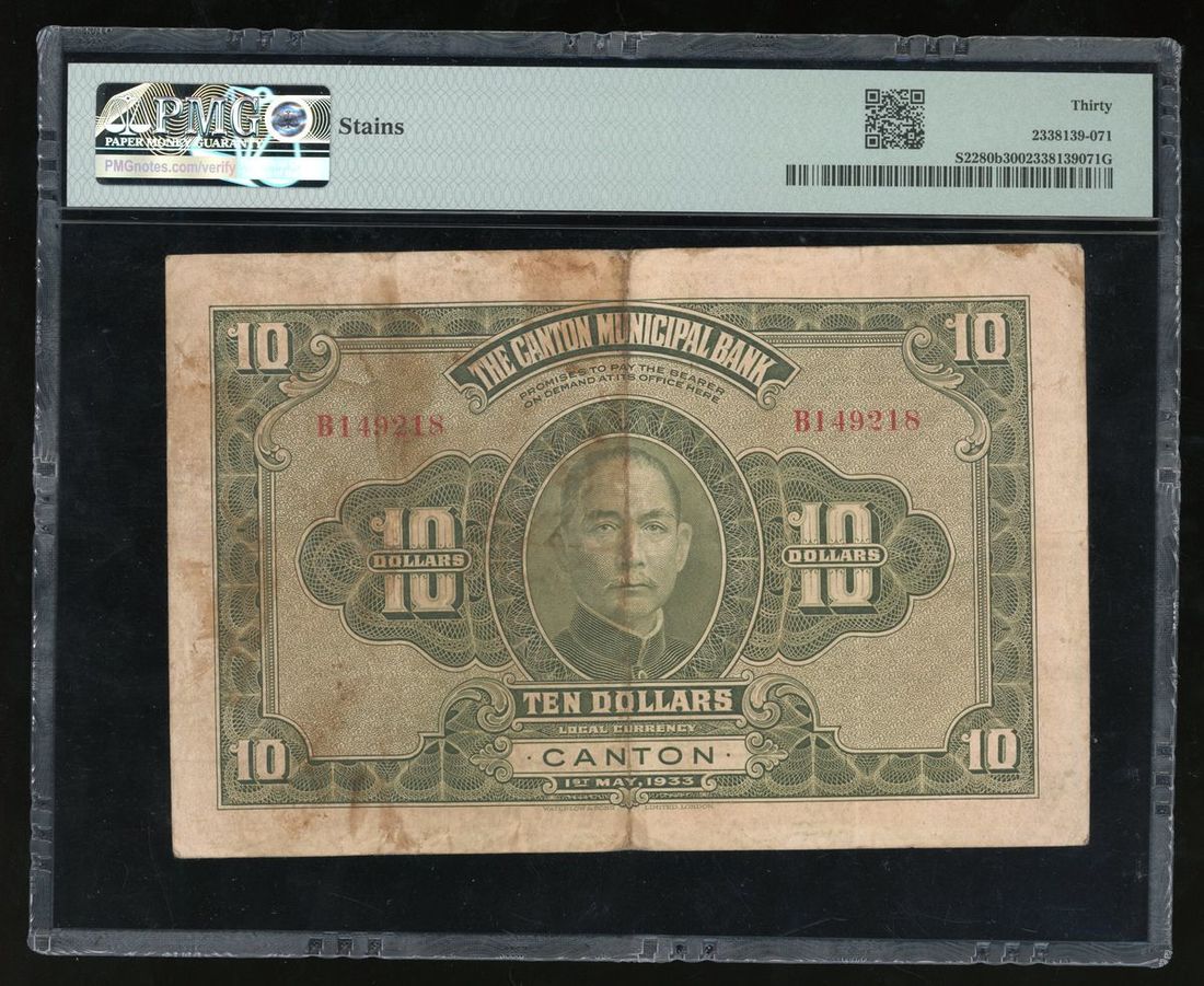 The Canton Municipal Bank, China, 10 dollars, 1933, serial number B149218, (Pick S2280b), PMG 30 Very Fine