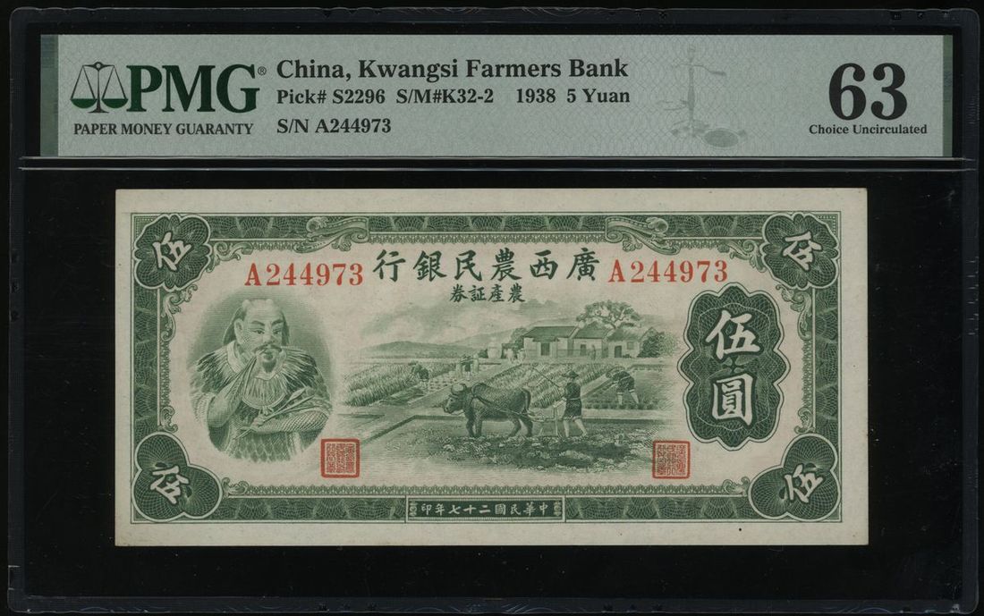 Kwangsi Farmers Bank, China, 5 Yuan, 1938, serial number A244973, Pick S2296 PMG 63