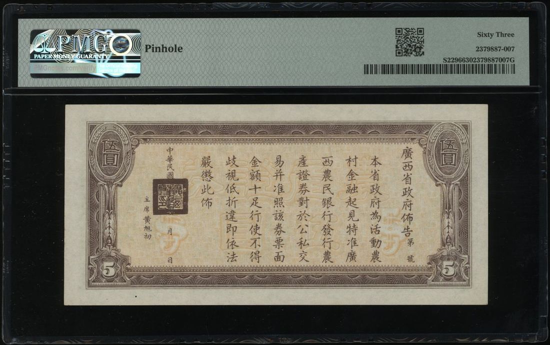 民國二十七年廣西農民銀行伍圓,編號A244973,PMG63