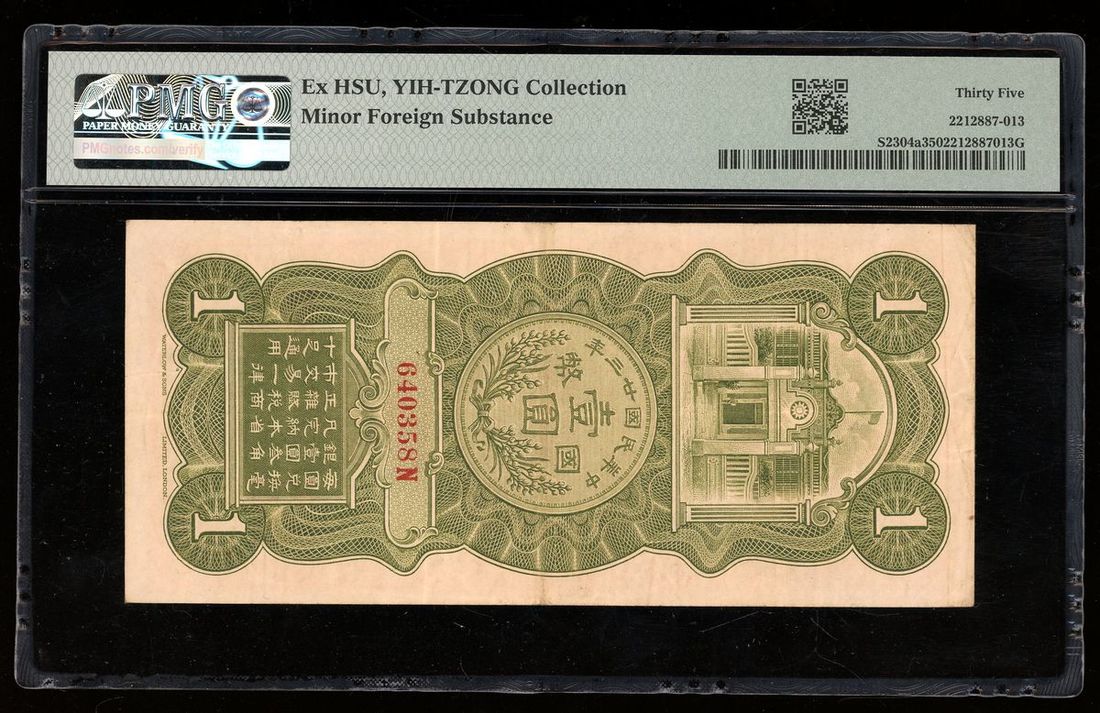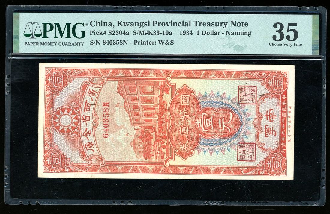 Kwangsi Provincial Treasury Note, China, $1, Year 23 (1934), Nanning, serial number 640358 N, (Pick S2304a), PMG 35 Choice Very Fine, Minor Foreign Substance, Not often seen. Ex Hsu Yih-Tzong Collection