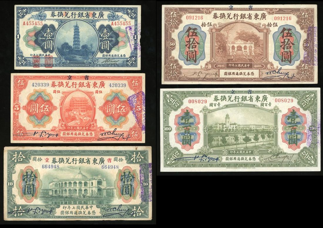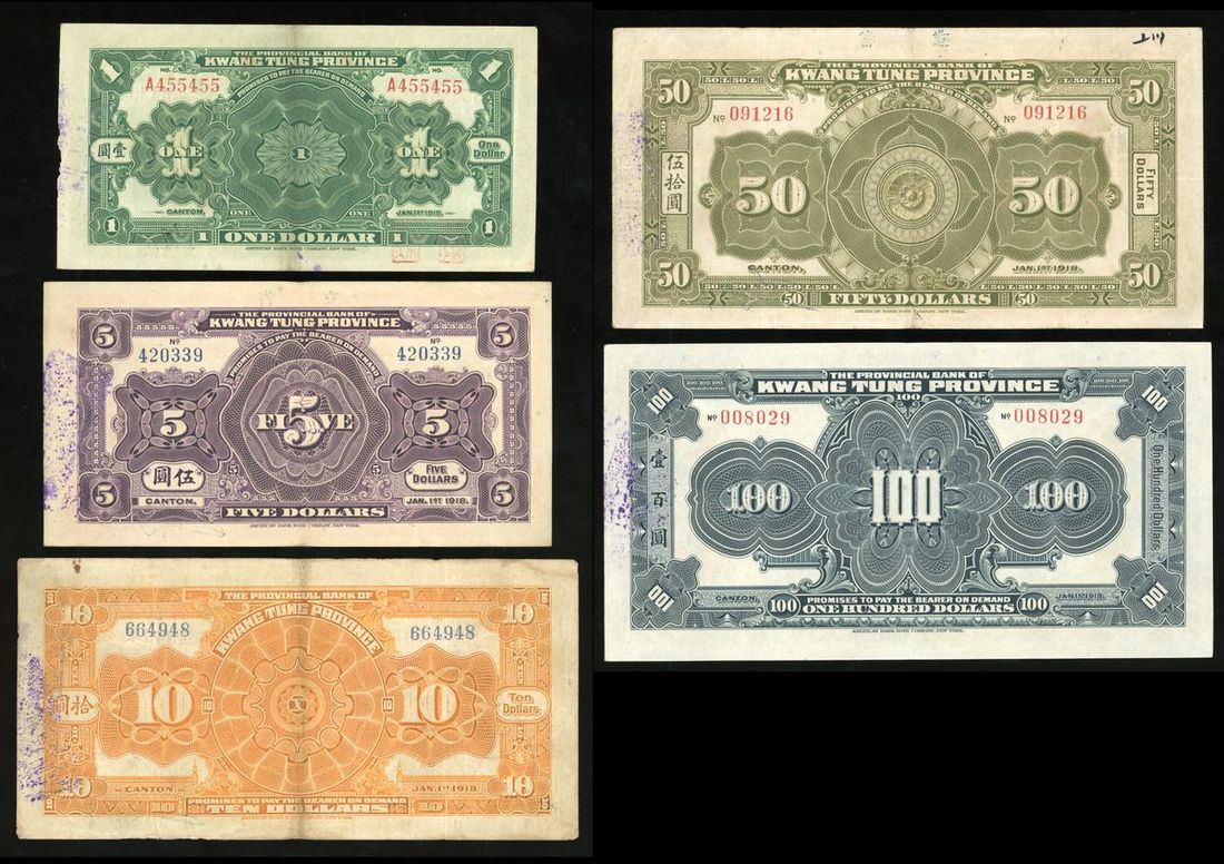 Provincial Bank of Kwang Tung Province, China, full set of the 1918 issue, including 1, 5, 10, 50 and 100 yuan, all with military stamp at right, -1 yuan, repeater serial number A455455,