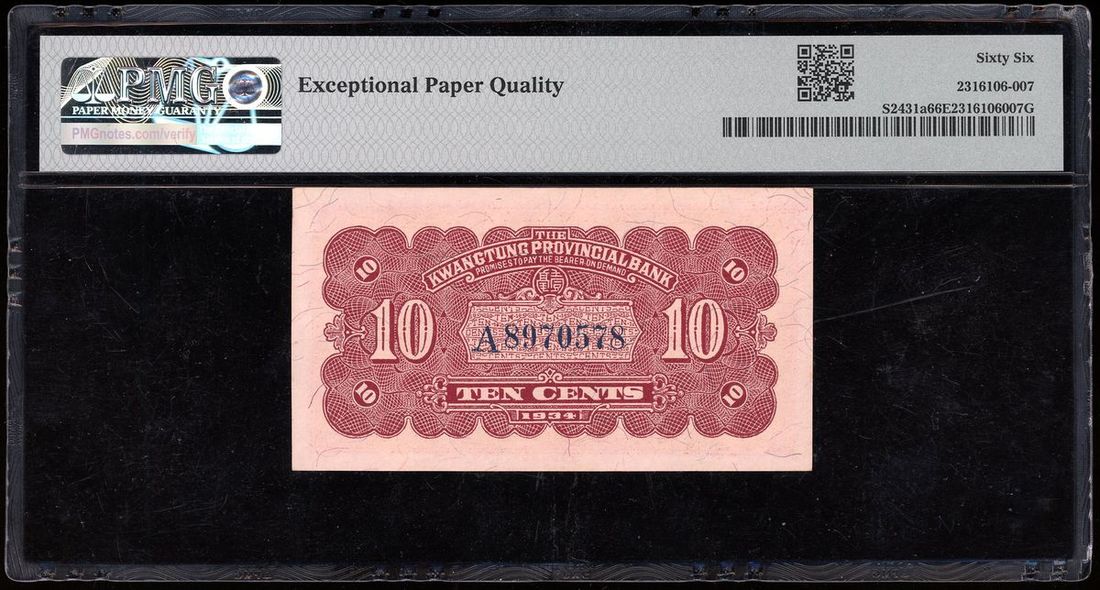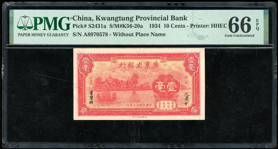 The Kwangtung Provincial Bank, China, 10 cents, 1934, serial number A 8970578, (Pick S2431a), PMG 66EPQ Gem Uncirculated