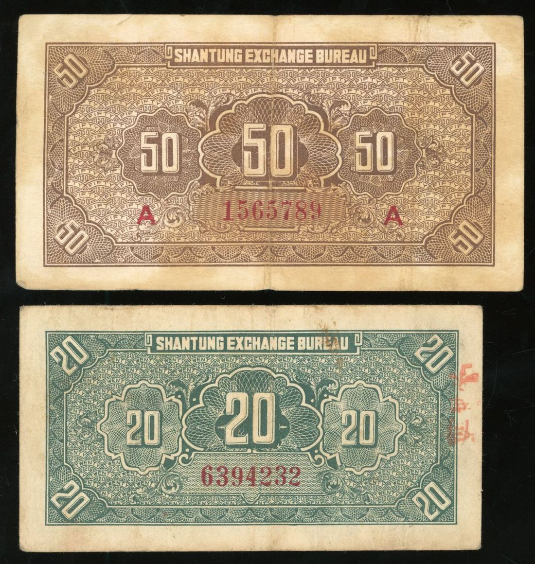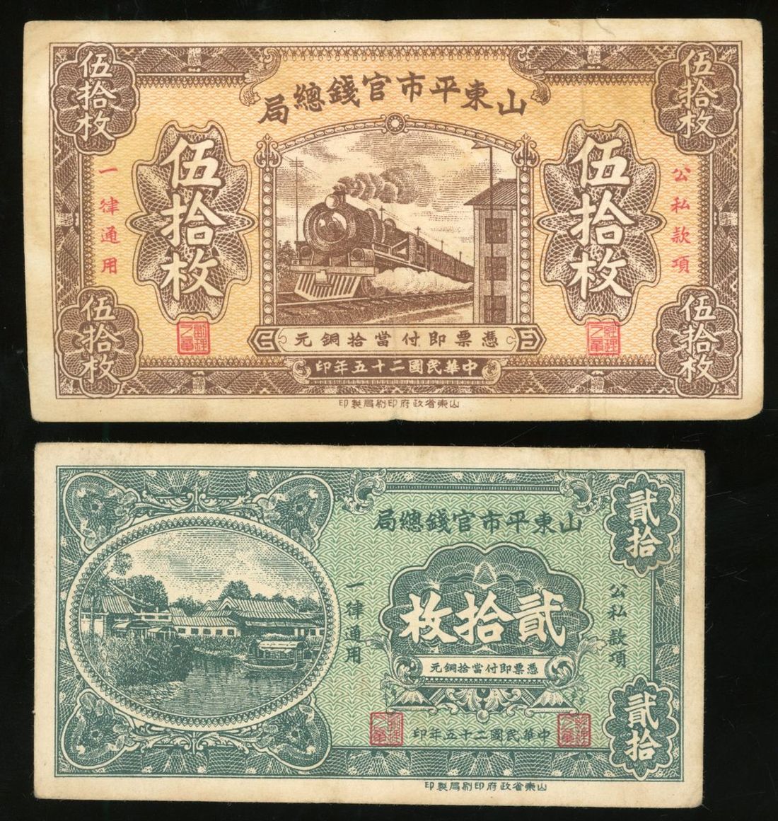 Shantung Provincial Bureau, China, a pair, Year 25 (1936), including 20 and 50 copper coins, (Pick S2710, S2711), very fine (2)