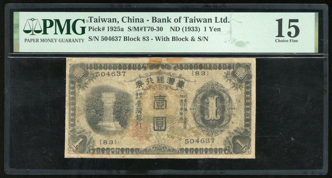 Bank of Taiwan, 1 yen, ND (1933), block 83, serial number 504637, (Pick 1925a), PMG 15 Choice Fine, Rust
