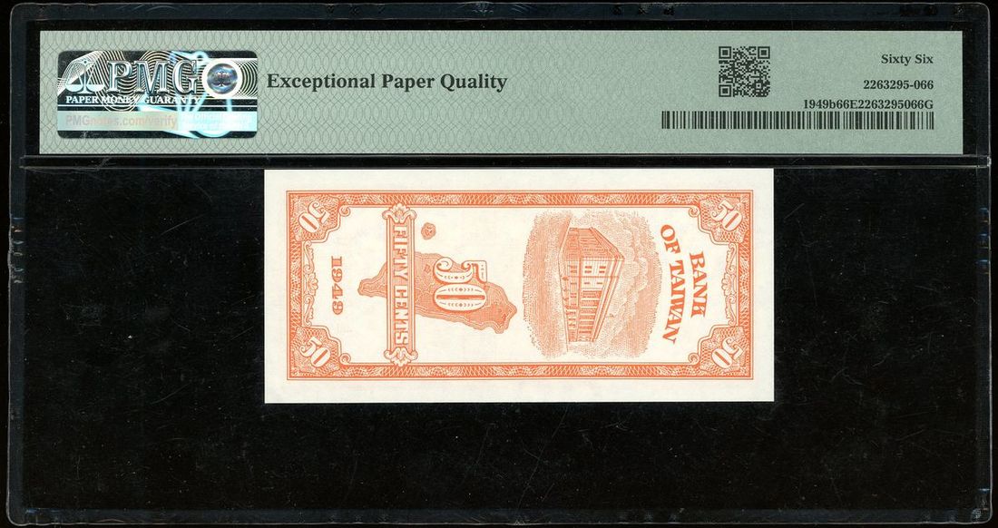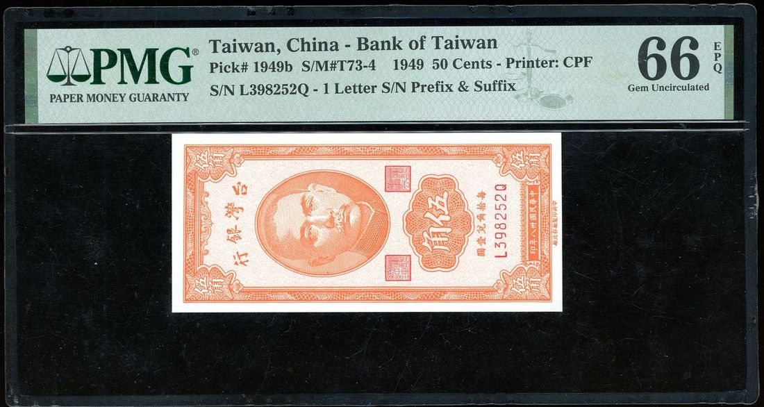 Bank of Taiwan, 50 cents, Year 38 (1949), serial number L 398252 Q, (Pick 1949b), PMG 66EPQ Gem Uncirculated