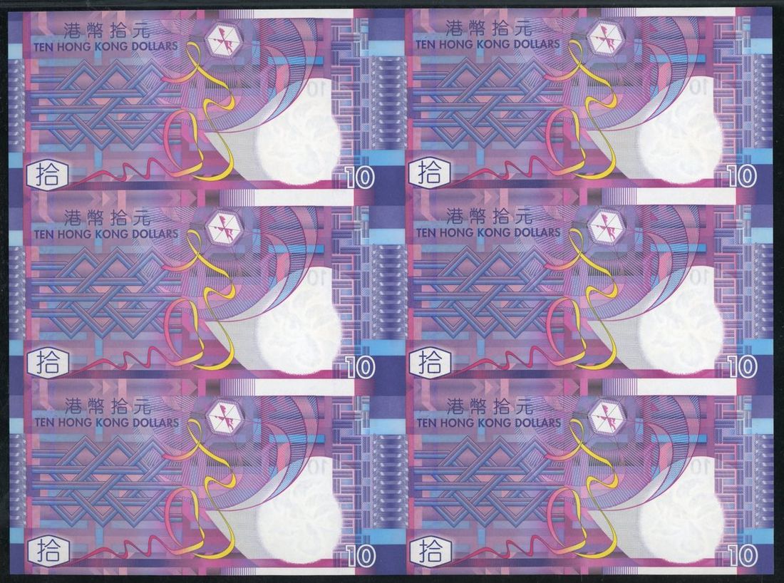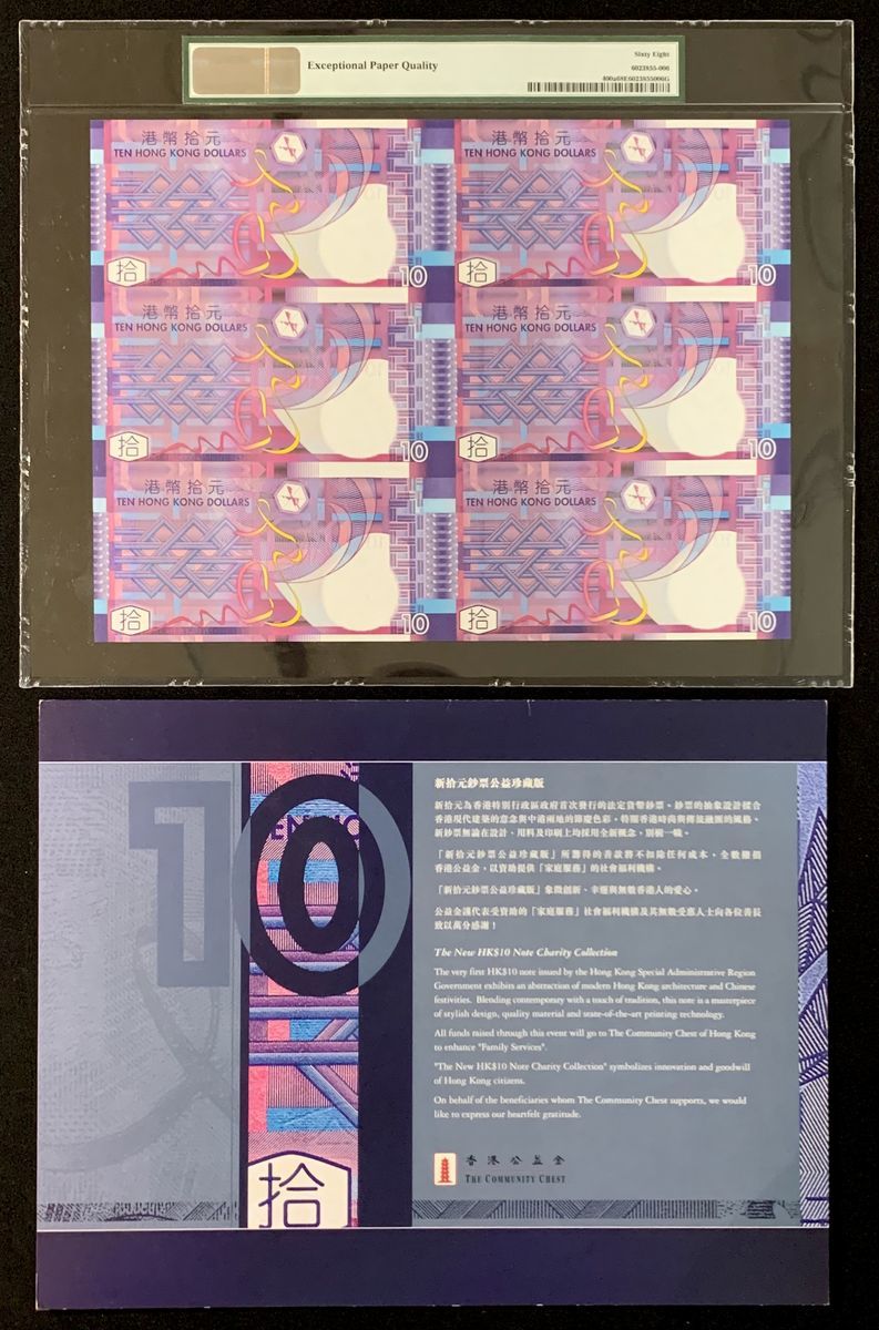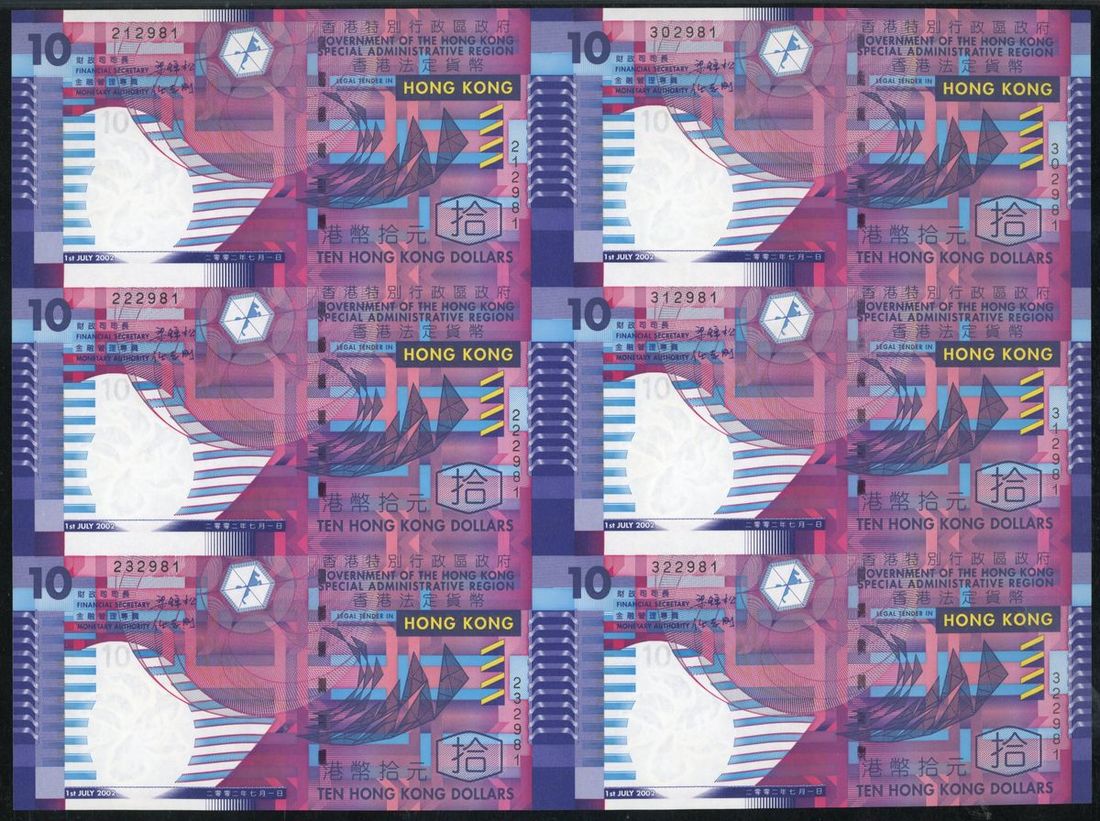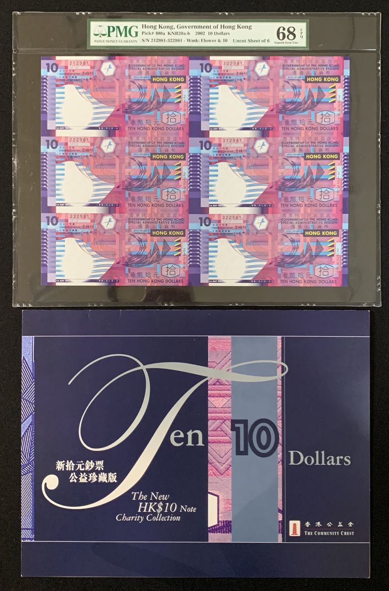 Government of HongKong, a sheet of six $10, 2002, serial numbers 212981-322981, (Pick 400a), PMG 68EPQ. With original presentation folder