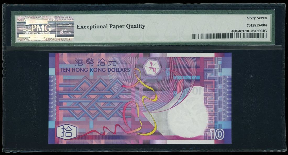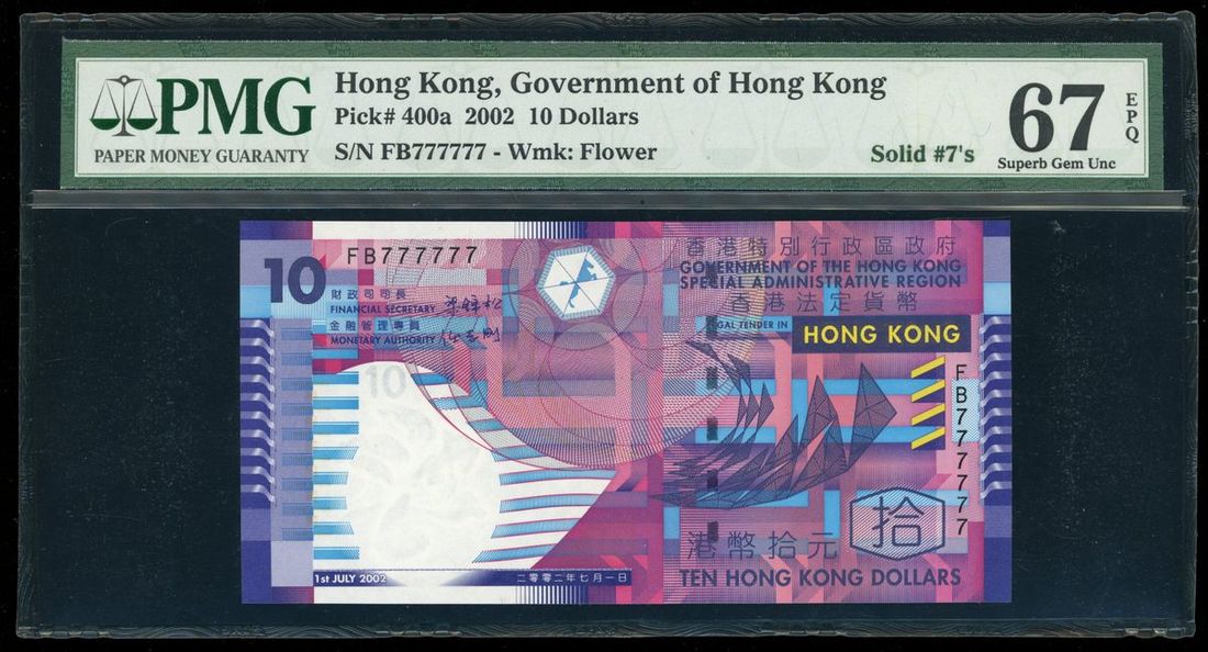 Government of HongKong, $10, 2002, solid serial number FB777777, (Pick 400a), PMG 67EPQ