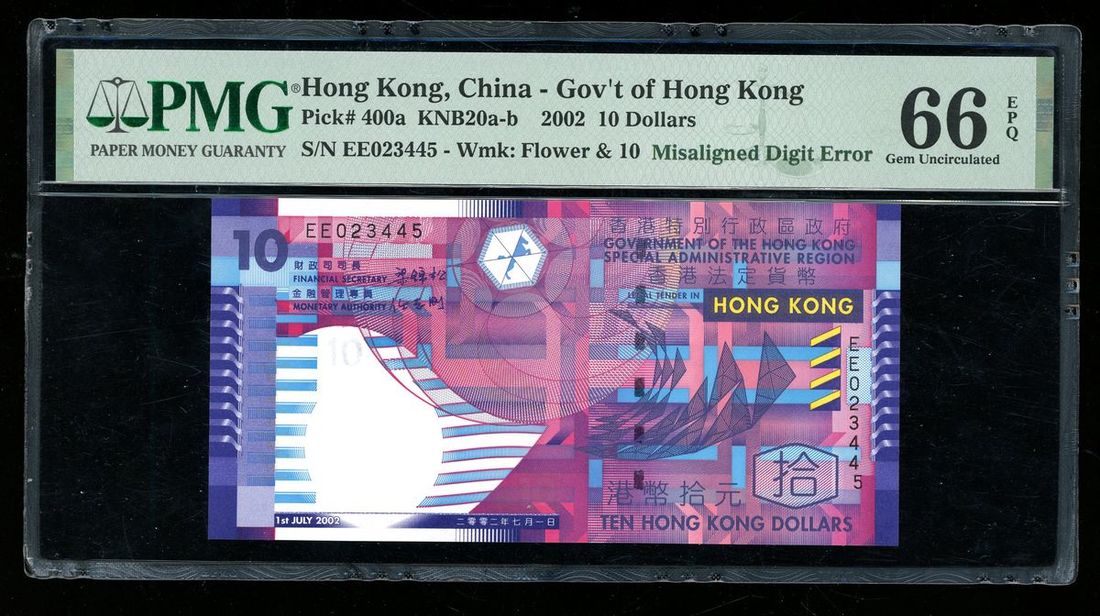 Government of HongKong, ERROR $10, 2002, serial number EE023445, last digit of serial number at right moved to the right,