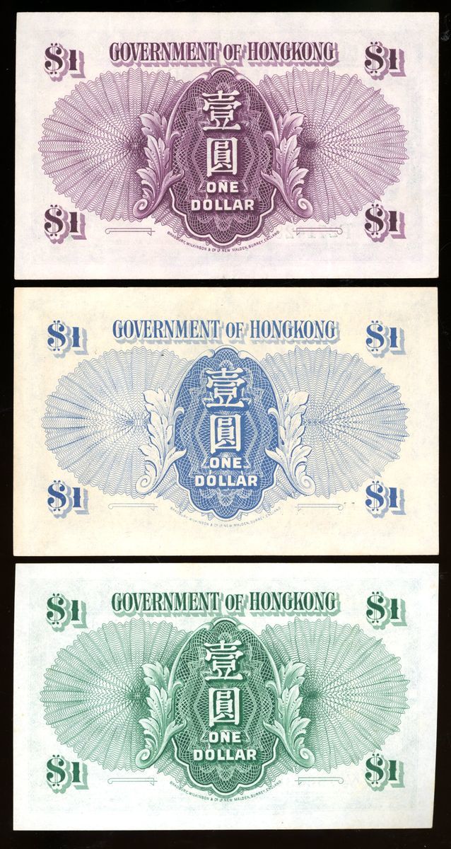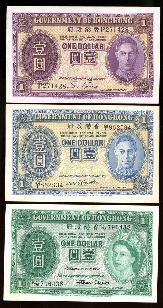 Government of HongKong, $1 (3), 1939, 1940, 1952, (Pick 312, 316, 324A), 1939 aEF, others with foxing aUNC (3)
