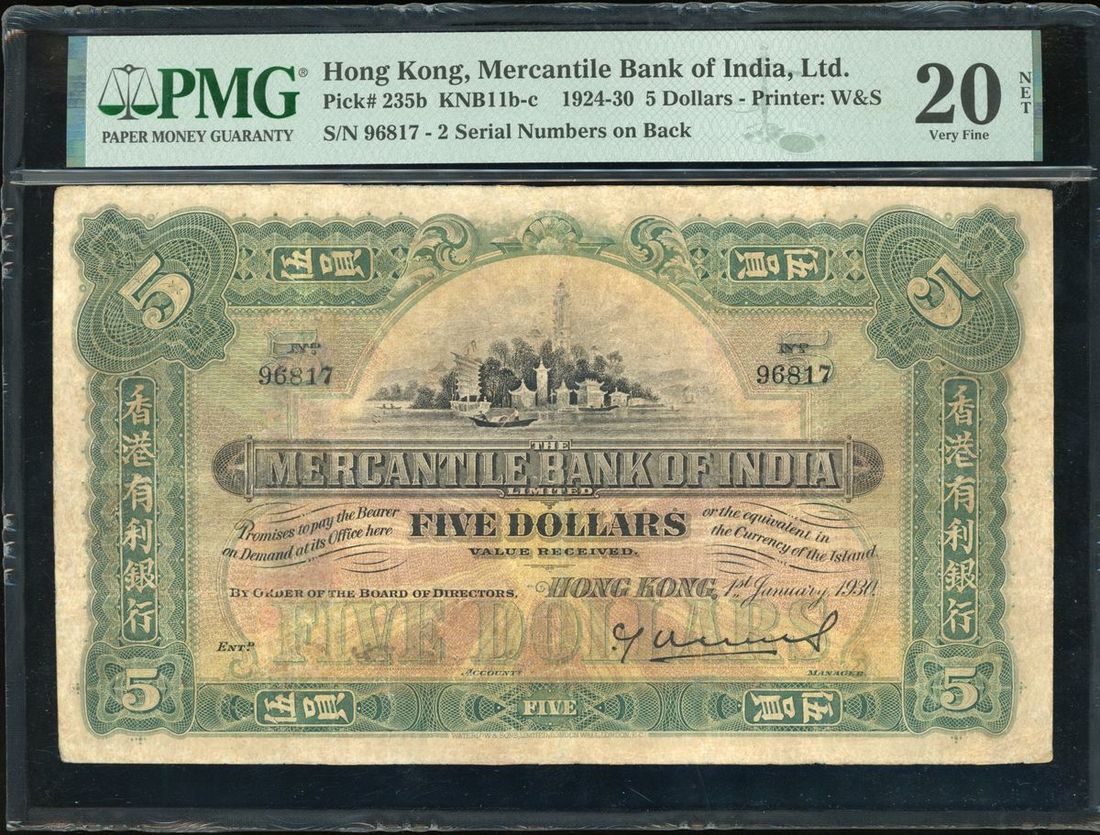 Mercantile Bank of India, Hong Kong, $5, 1.1.1930, serial number 96817, green, handsigned signature at bottom left,