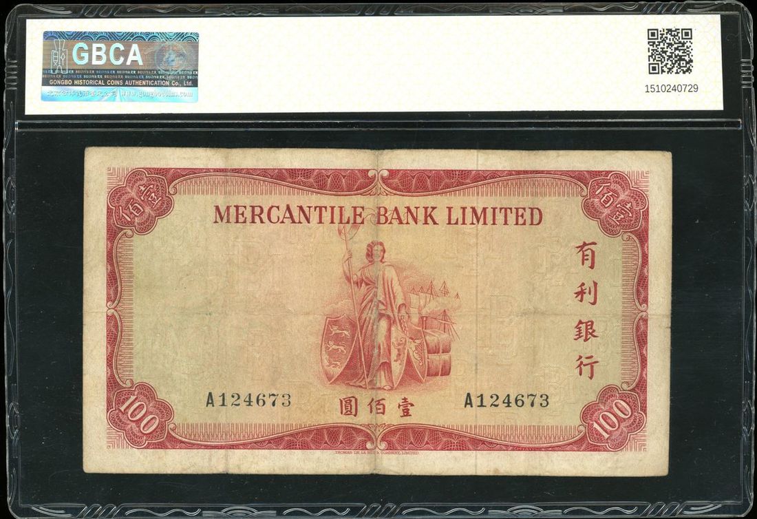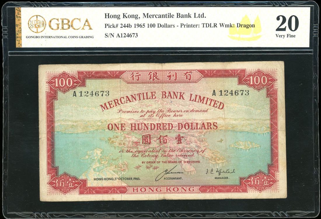 Mercantile Bank Limited, Hong Kong, $100, 5.10.1965, serial number A124673, (Pick 244b), GBCA 20