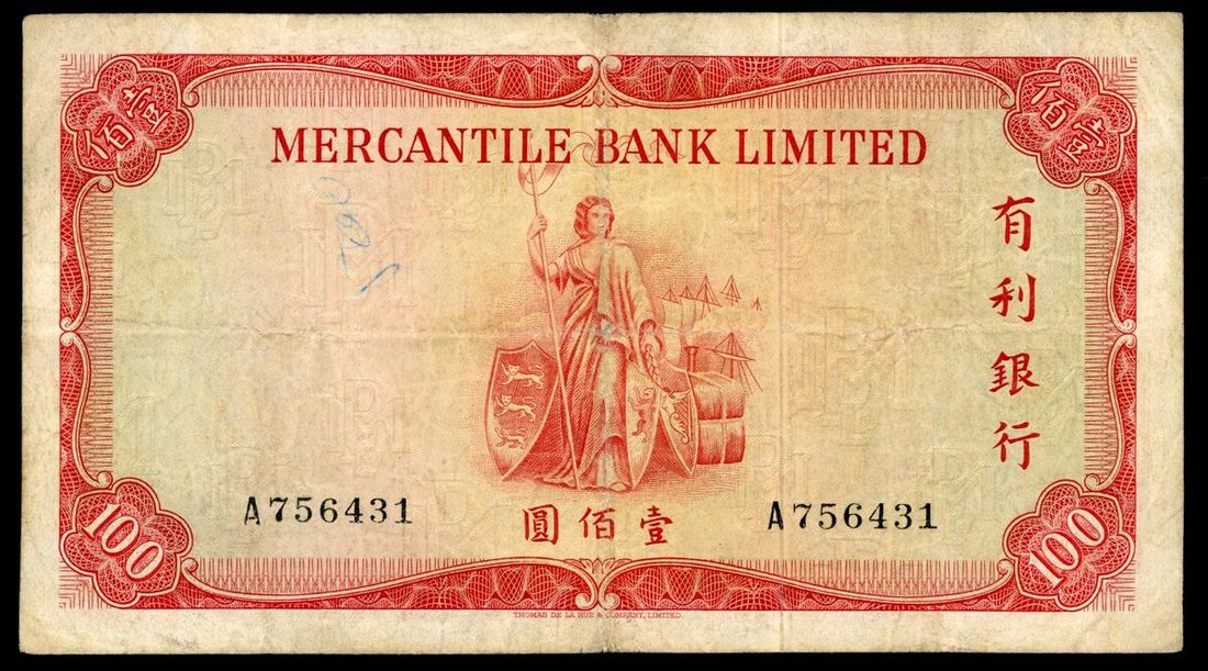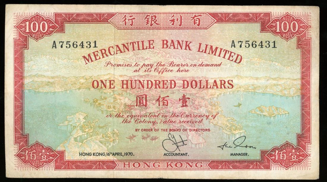 Mercantile Bank Limited, Hong Kong, $100, 16.4.1970, serial number A 756431, (Pick 244d), Very Fine, Annotation on reverse