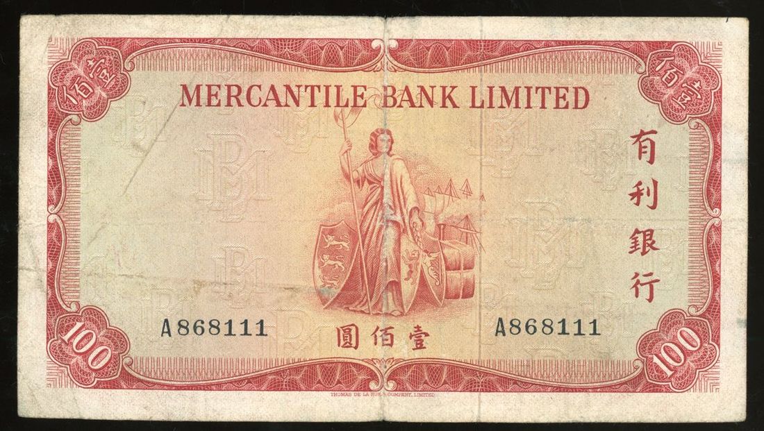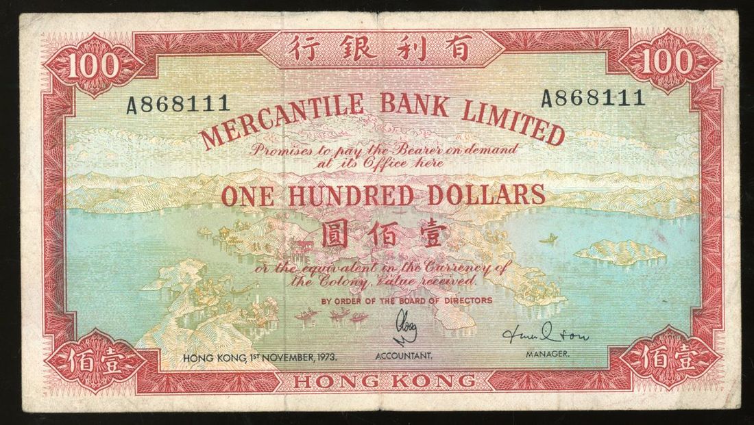 Mercantile Bank Limited, Hong Kong, $100, 1.11.1973, serial number A 868111, (Pick 244e), Very Fine