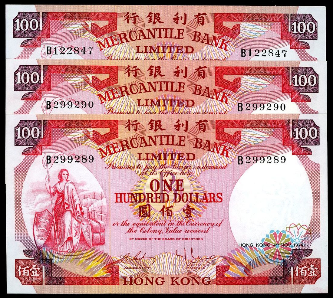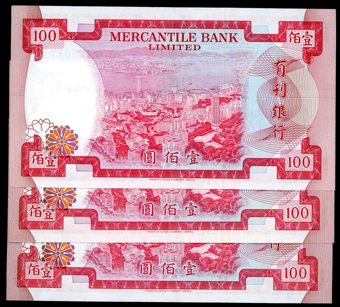 Mercantile Bank, Hong Kong, $100 (3), 4.11.1974, (Pick 245), all with one light centre fold, good extremely fine (3)