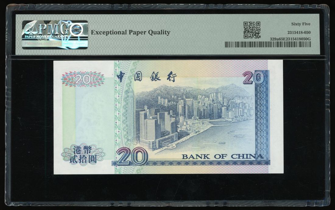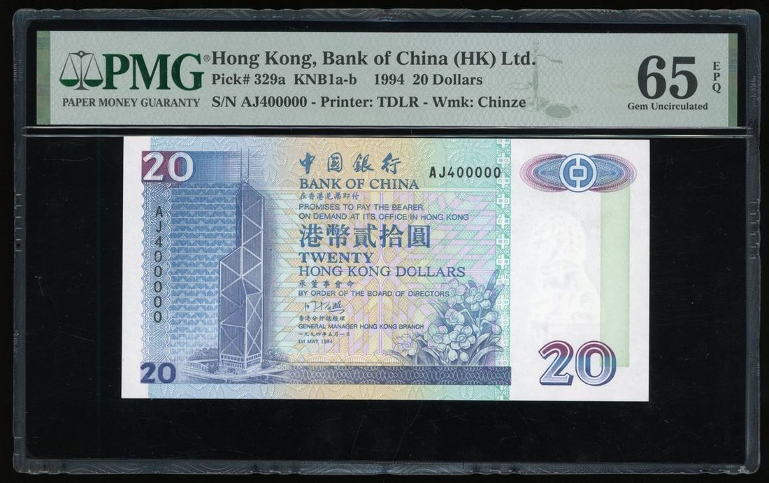 Bank of China, Hong Kong, $20, 1.5.1994, fancy serial number AJ 400000, (Pick 329a), PMG 65EPQ Gem Uncirculated