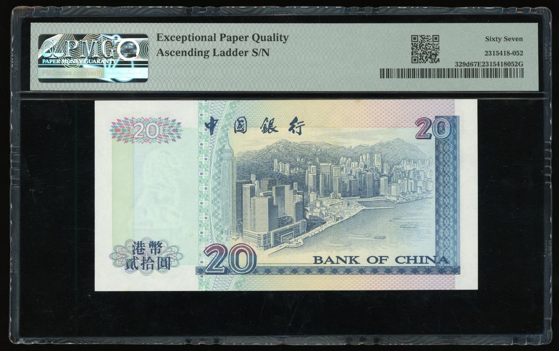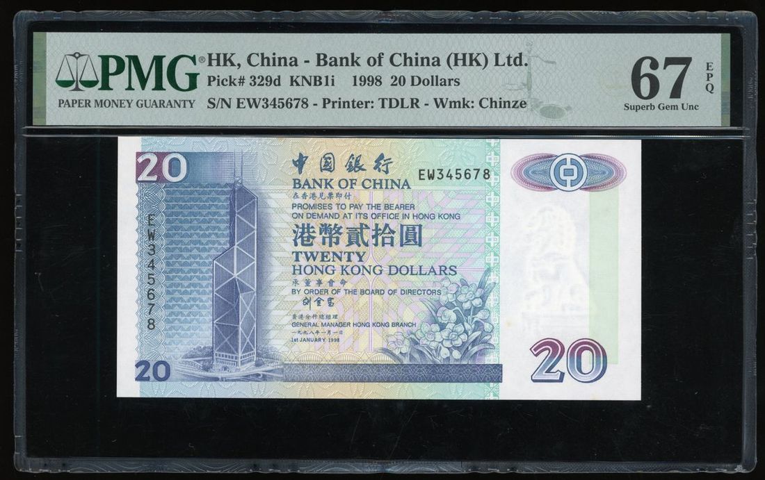 Bank of China, Hong Kong, $20, 1.1.1998, ascending ladder serial number EW 345678, (Pick 329d), PMG 67EPQ Superb Gem Uncirculated