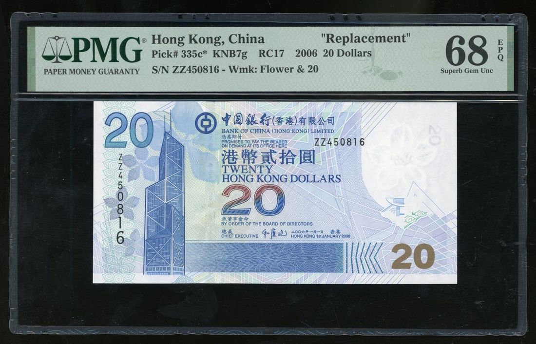 Bank of China, Hong Kong, replacement $20, 1.1.2006, serial number ZZ 450816, (Pick 335c*), PMG 68EPQ