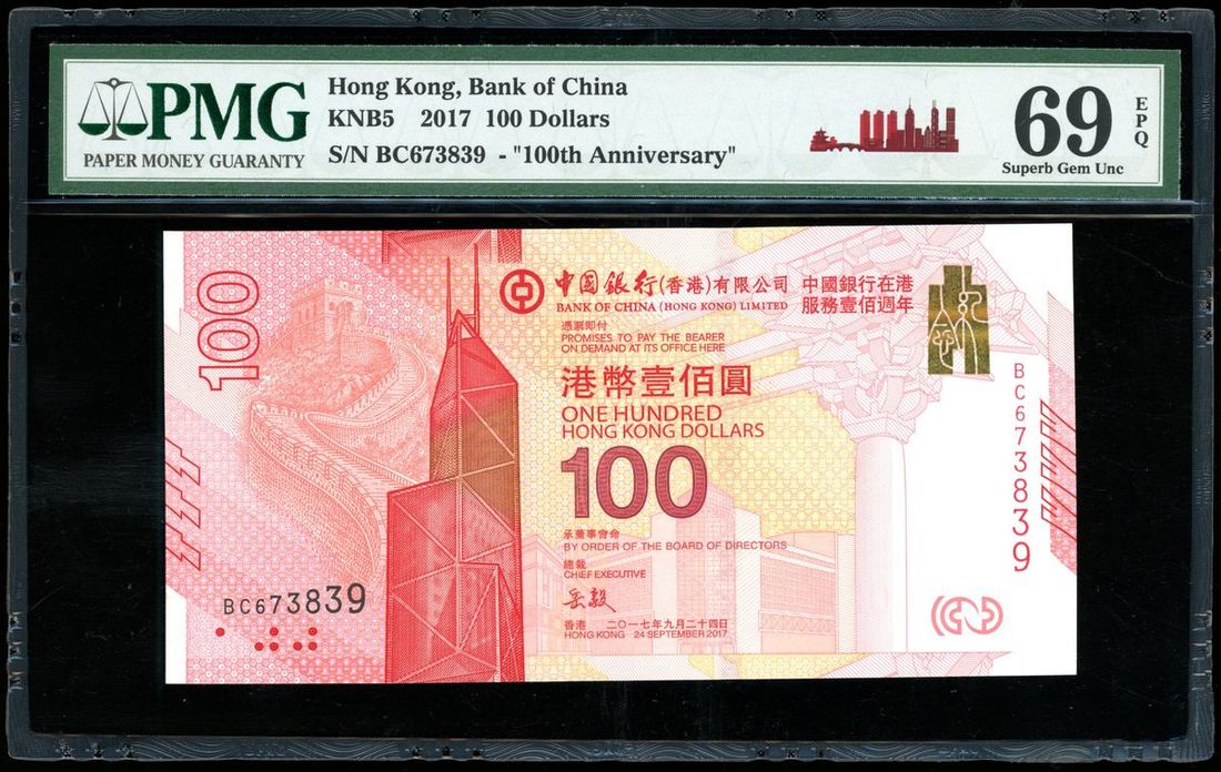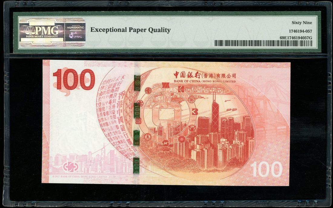 Bank of China, Hong Kong, $100, 24.9.2017, serial number BC673839, PMG 69EPQ. PMG 2nd highest grade