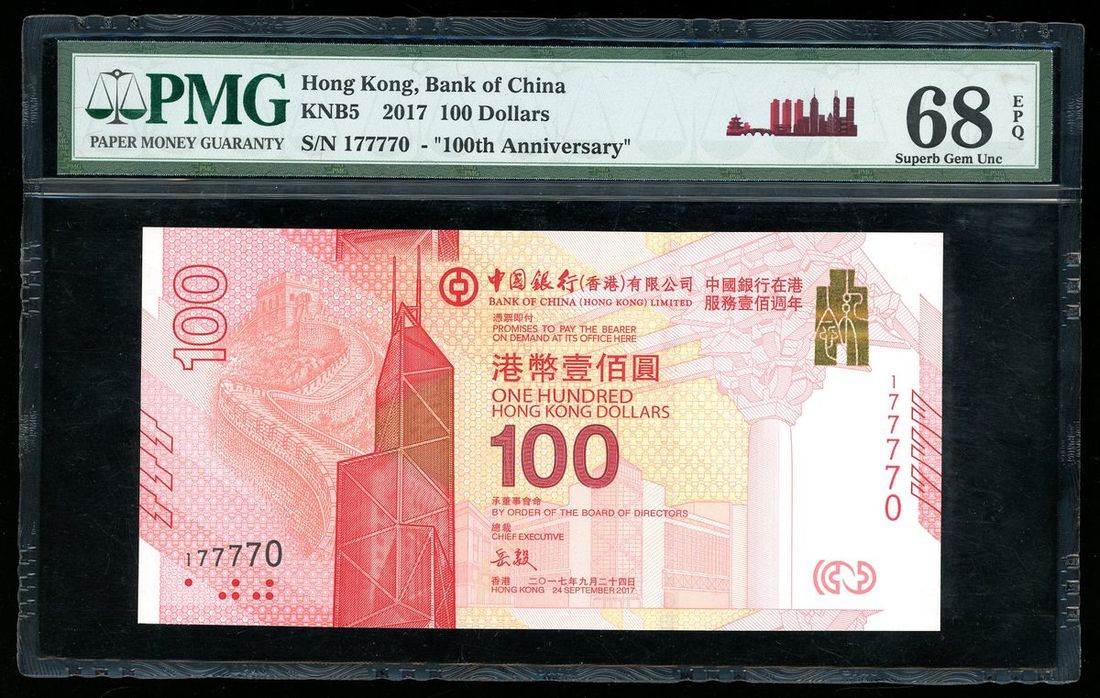 Bank of China, $100, 24.9.2017, 100th Anniversary of the Bank in Hong Kong, serial number 177770, (Pick 347)