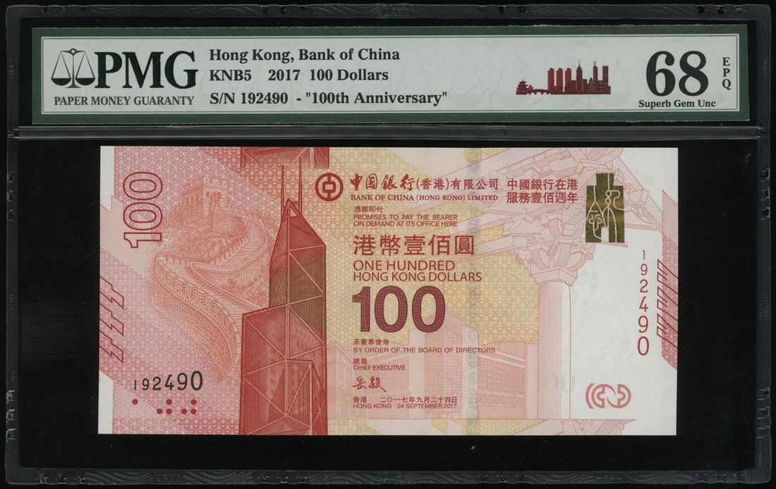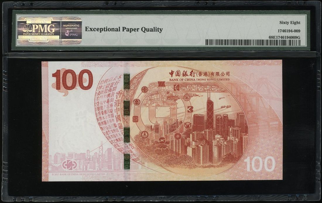 Bank of China, Hong Kong , $100, 2017, serial number 192490, PMG 68EPQ