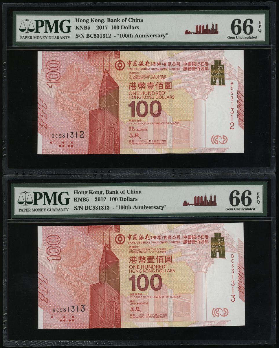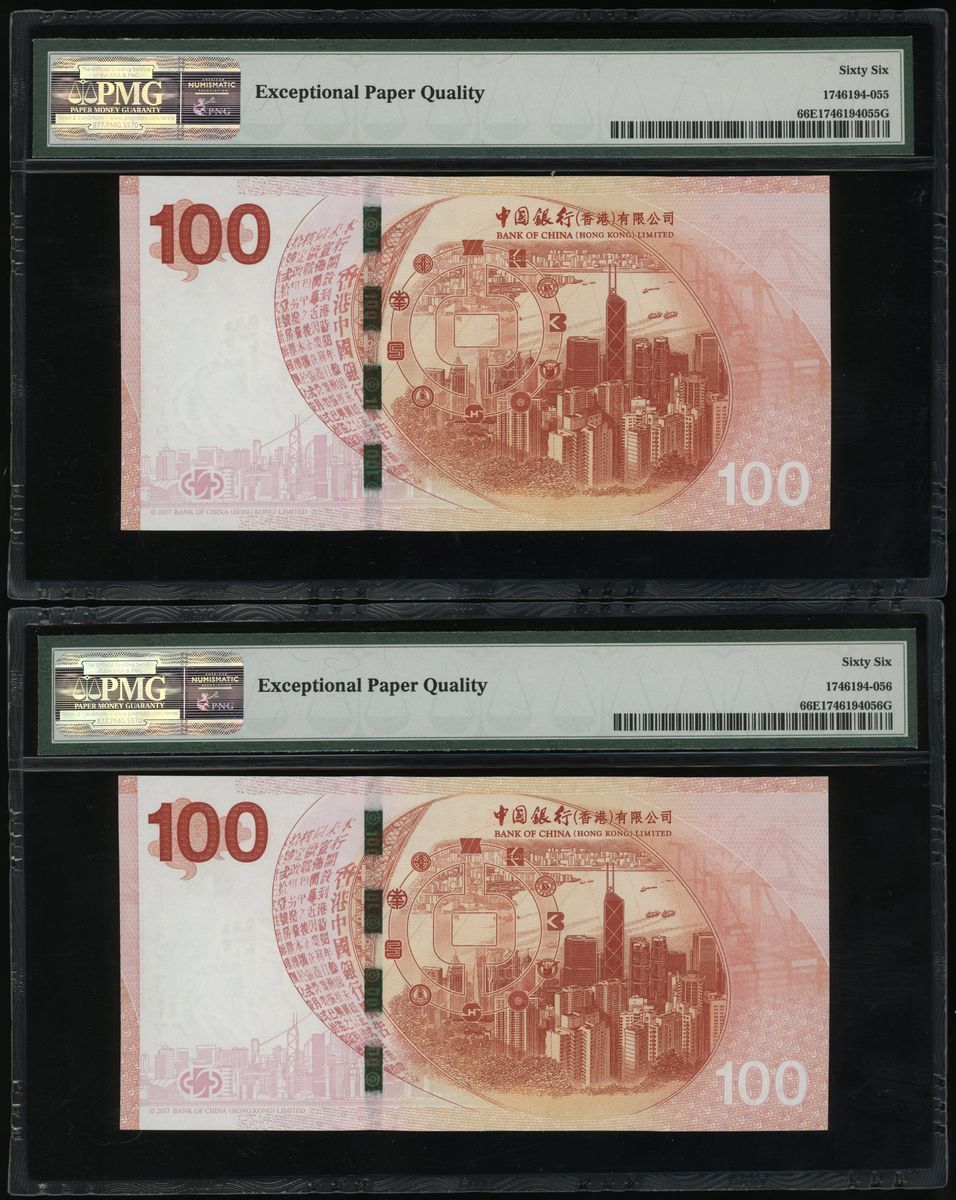 Bank of China, Hong Kong, consecutive pair $100, 2017, serial numbers BC531312/13, both PMG 66EPQ (2)