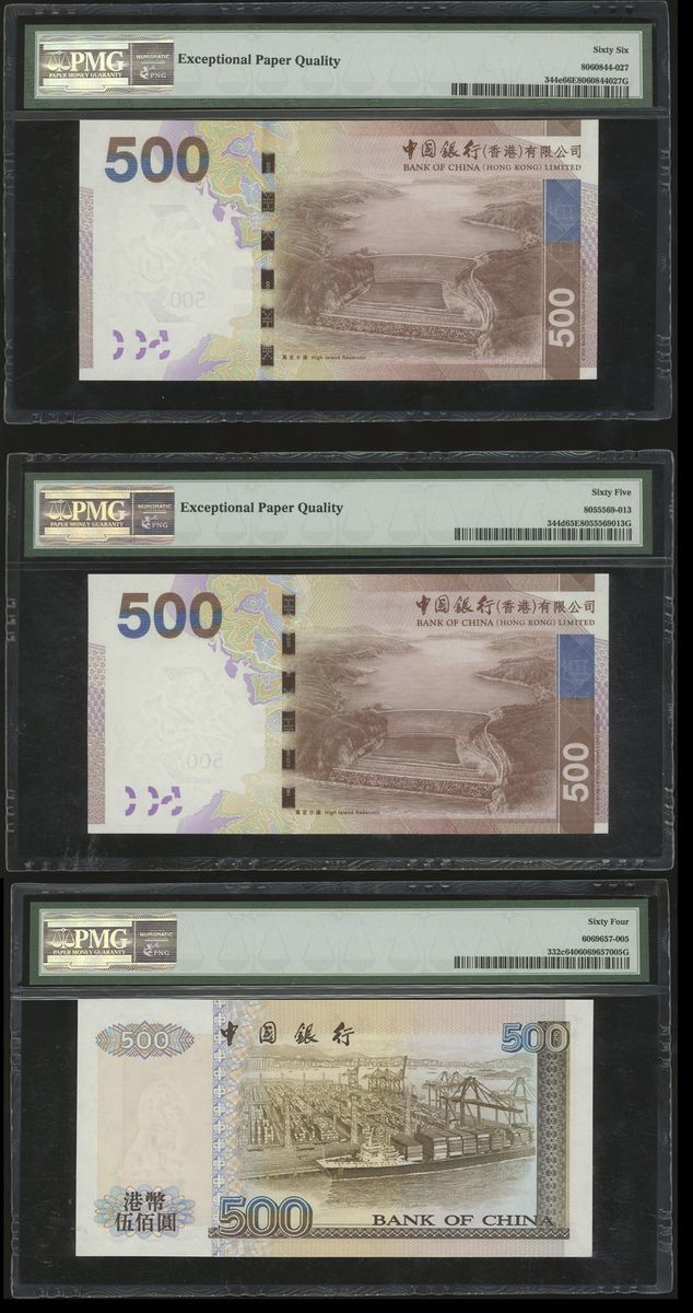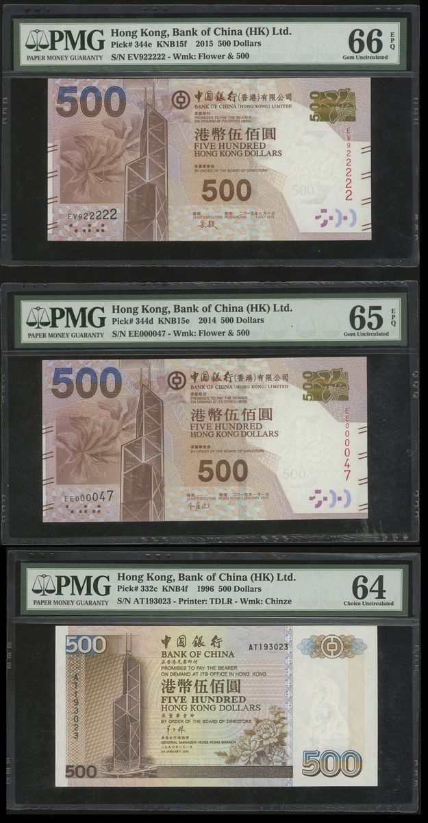 Bank of China (Hong Kong) Limited, a trio of $500, 1.1.1996, 1.1.2014 and 1.7.2015, serial numbers AT193023, EE000047 and near solid serial number EV922222, (Pick 332c, 344e and 344d), graded PMG 64, 65EPQ  and 66EPQ respectively (3).