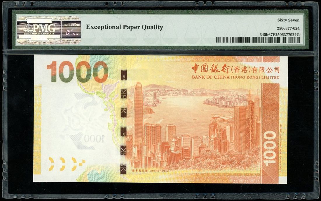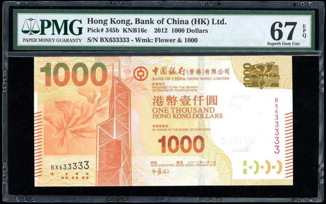 Bank of China, Hong Kong, $1000, 1.1.2012, near solid serial number BX633333, (Pick 345b), PMG 67EPQ