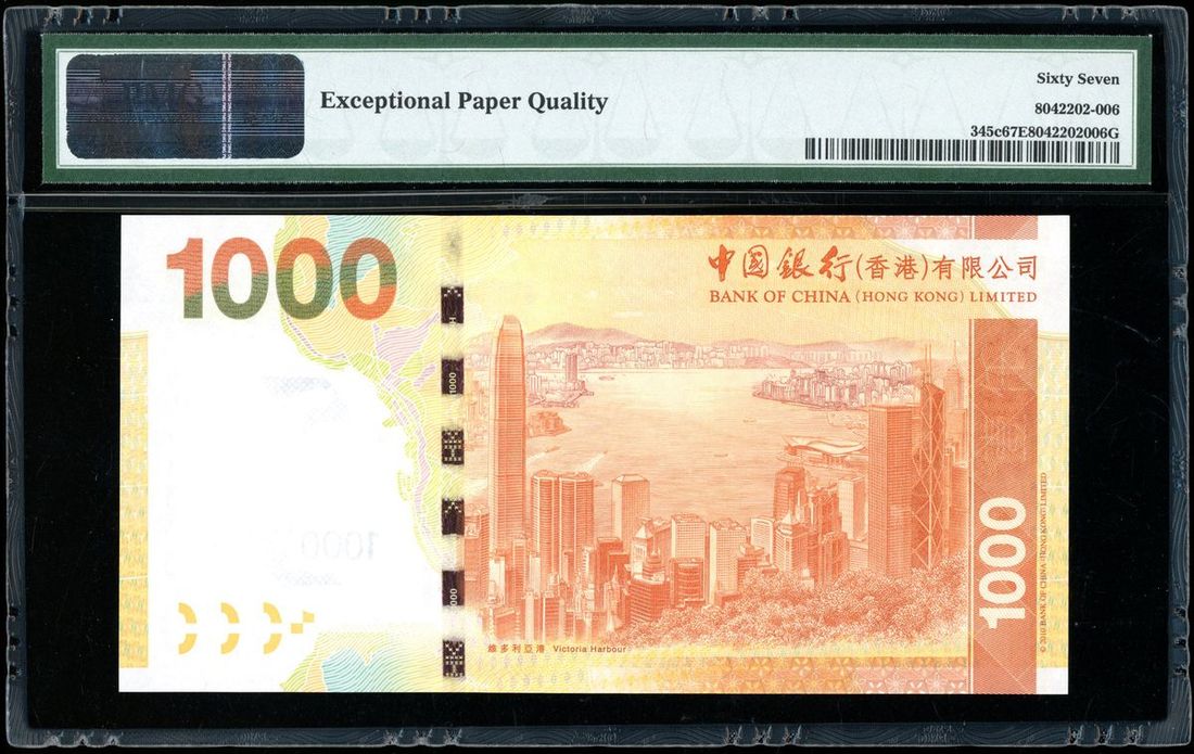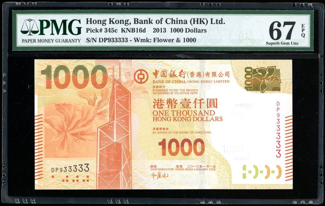 Bank of China, Hong Kong, $1000, 1.1.2013, near solid serial number DP933333, (Pick 345c), PMG 67EPQ
