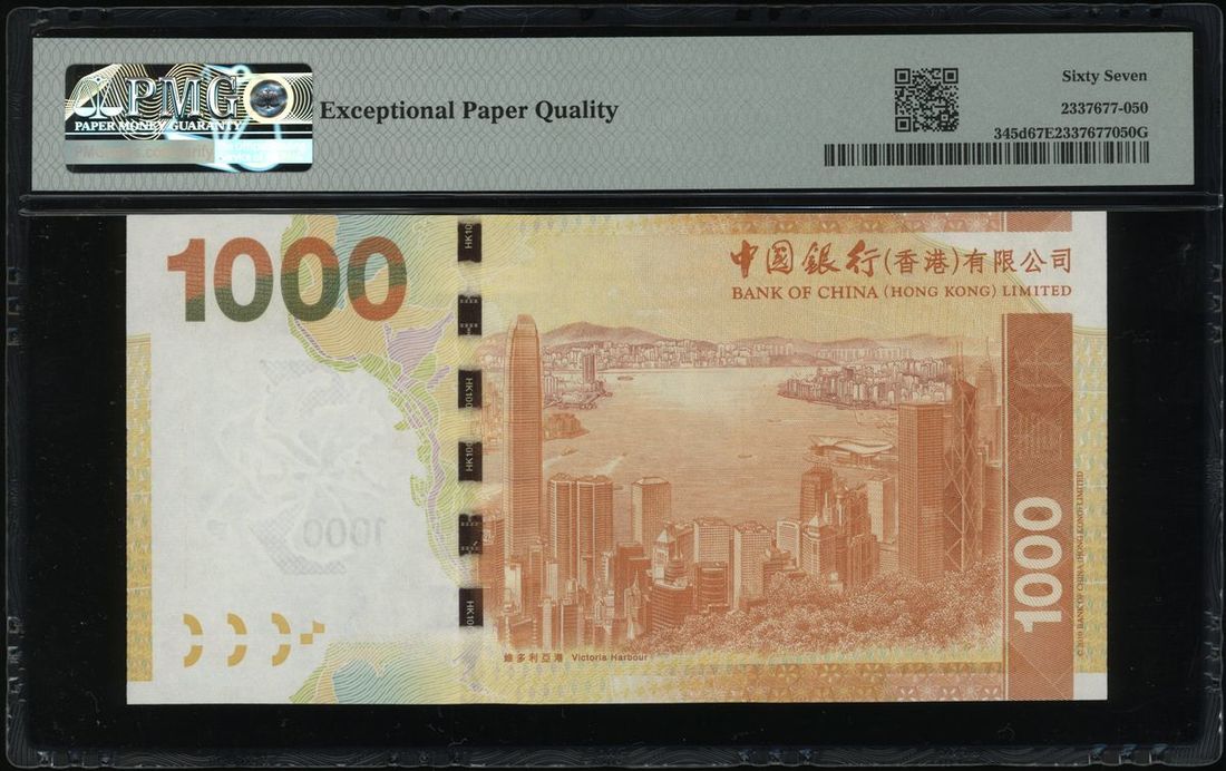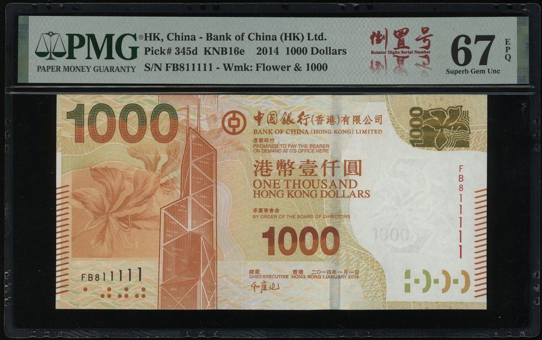 Bank of China, Hong Kong, $1000, 2014, rotator digits serial number FB811111, (Pick 345d), PMG 67EPQ.