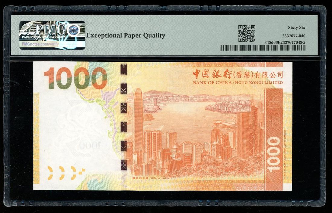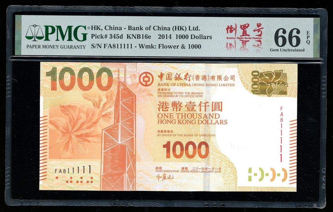 Bank of China, Hong Kong, $1000, 2014, rotator digits serial number FA811111, (Pick 345d), PMG 66EPQ.