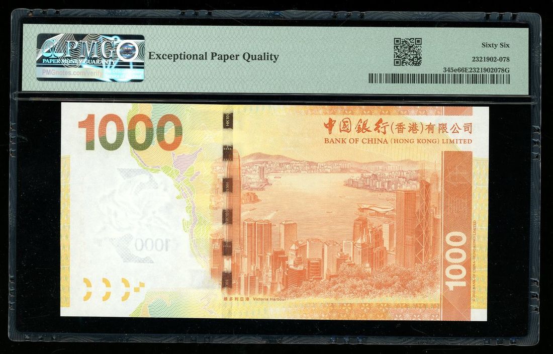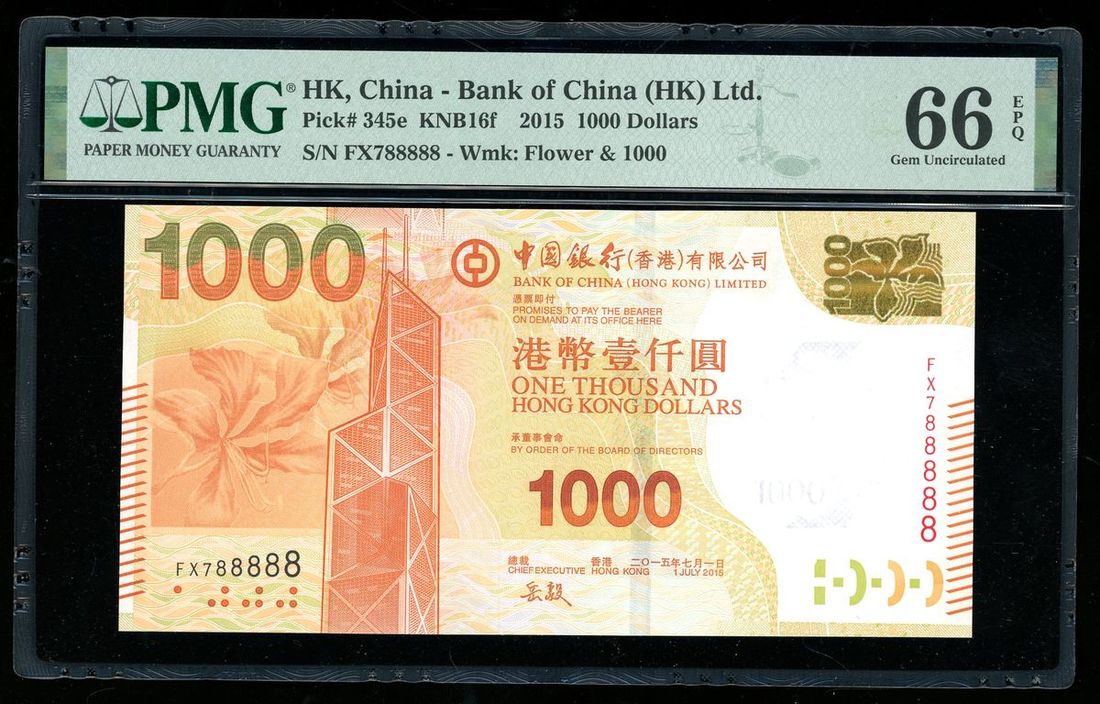 Bank of China, Hong Kong, $1000, 2015, near solid serial number FX788888, (Pick 345e), PMG 66EPQ.