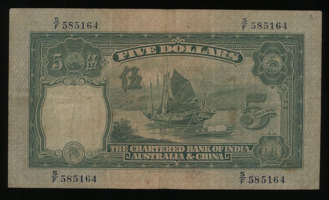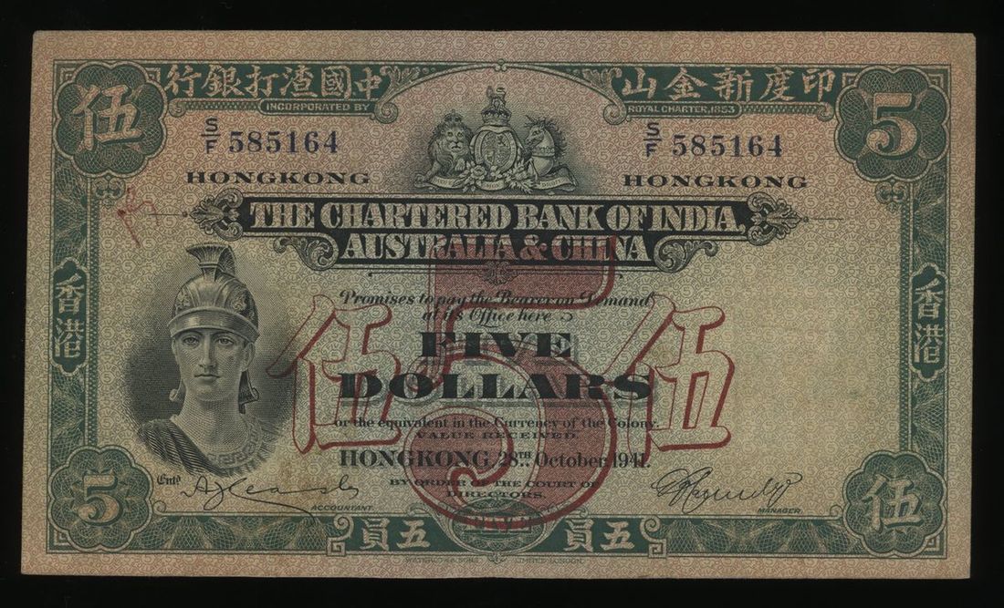 The Chartered Bank of India, Australia & China, Hong Kong, $5, 28.10.1941, serial number S/F585164, (Pick 54b), stains, very fine.