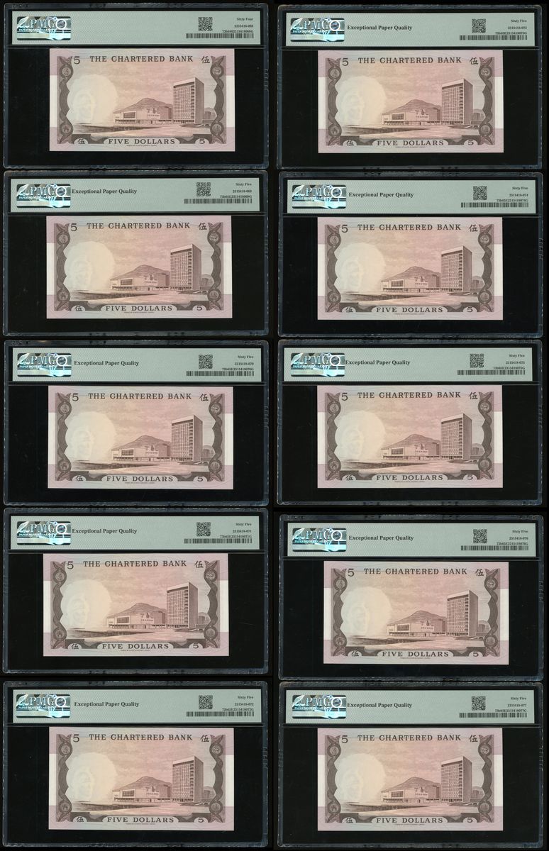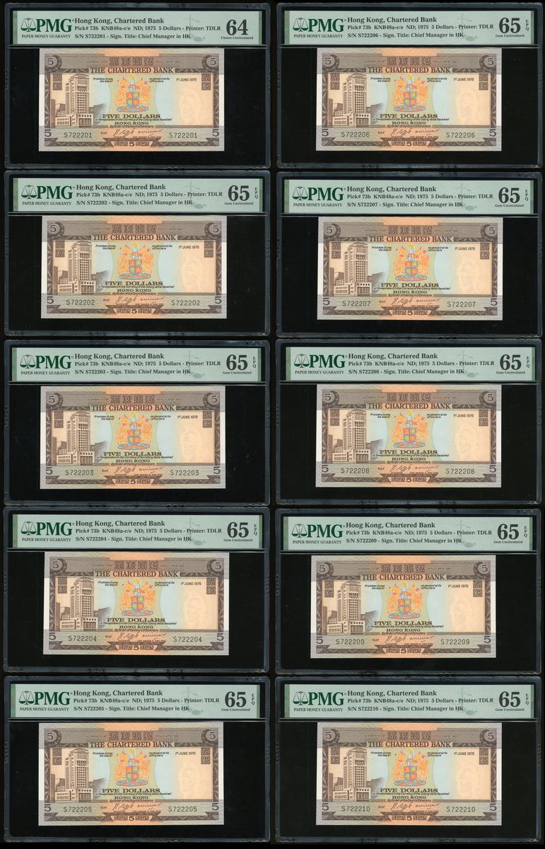 The Chartered Bank, Hong Kong, a consecutive group of 10x $5, ND (1975), serial numbers S722201-10, (Pick 73b) 722201 graded PMG 64 Choice Uncirculated, the rest all graded 65EPQ Gem Uncirculated (10)